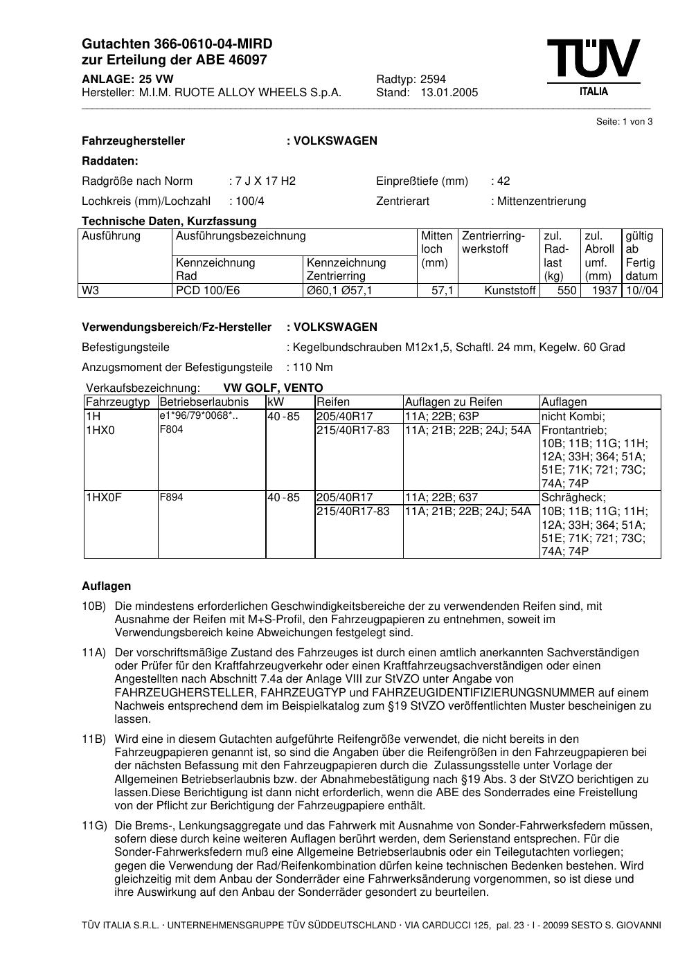 Dieses Gutachten (abe) bezieht sich auf die Alufelge M.I.M. RUOTE ALLOY WHEELS S.p.A. 2594 in der Ausführung ET 0, Mittenloch 0 mm (KBA 46097). Im PDF findest du typischerweise zulässige Reifengrößen, Auflagen/Anbauhinweise und – je nach Dokument – Hinweise zur Eintragung.