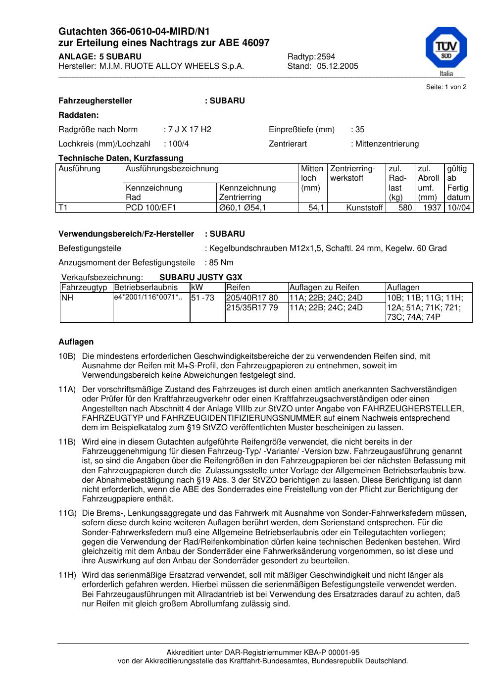 Dieses Gutachten (abe) bezieht sich auf die Alufelge M.I.M. RUOTE ALLOY WHEELS S.p.A. 2594 in der Ausführung ET 0, Mittenloch 0 mm (KBA 46097). Im PDF findest du typischerweise zulässige Reifengrößen, Auflagen/Anbauhinweise und – je nach Dokument – Hinweise zur Eintragung.