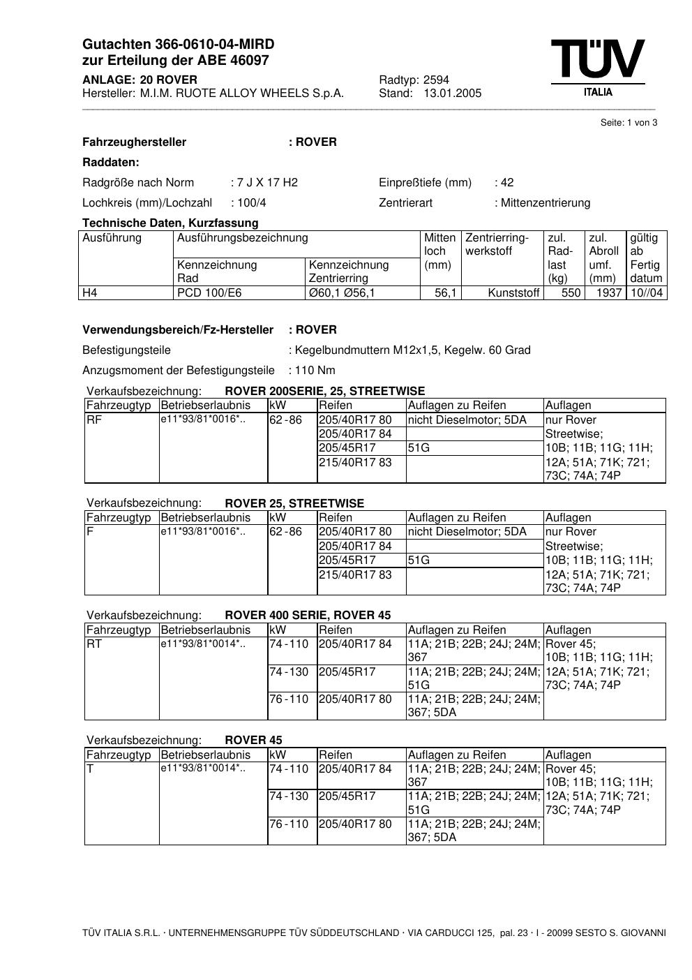 Dieses Gutachten (abe) bezieht sich auf die Alufelge M.I.M. RUOTE ALLOY WHEELS S.p.A. 2594 in der Ausführung ET 0, Mittenloch 0 mm (KBA 46097). Im PDF findest du typischerweise zulässige Reifengrößen, Auflagen/Anbauhinweise und – je nach Dokument – Hinweise zur Eintragung.
