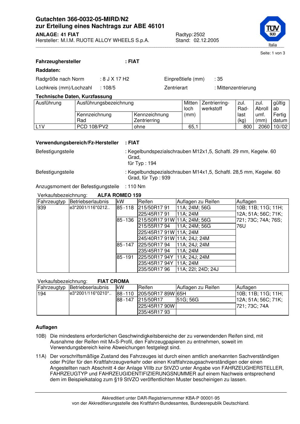 Felgengutachten / abe für Alufelgen M.I.M. RUOTE ALLOY WHEELS S.p.A. 2502 (ET 0, Mittenloch 0 mm) mit KBA 46101 (Zertifikatsnummer 46101). Hier kostenlos als PDF herunterladen. Der Download-Link ist 24 Stunden gültig und kann bis zu zwei Mal verwendet werden.