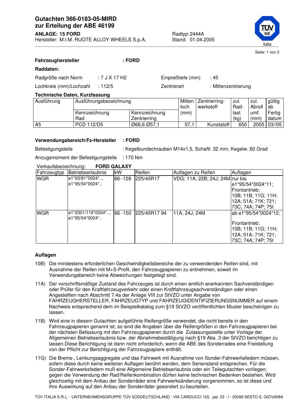 Dieses Gutachten (abe) bezieht sich auf die Alufelge M.I.M. RUOTE ALLOY WHEELS S.p.A. 2444A in der Ausführung ET 0, Mittenloch 0 mm (KBA 46199). Im PDF findest du typischerweise zulässige Reifengrößen, Auflagen/Anbauhinweise und – je nach Dokument – Hinweise zur Eintragung.
