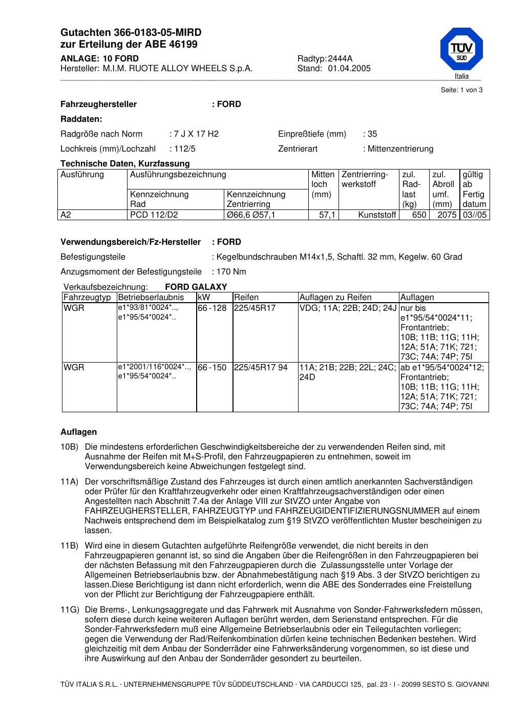 Felgengutachten / abe für Alufelgen M.I.M. RUOTE ALLOY WHEELS S.p.A. 2444A (ET 0, Mittenloch 0 mm) mit KBA 46199 (Zertifikatsnummer 46199). Hier kostenlos als PDF herunterladen. Der Download-Link ist 24 Stunden gültig und kann bis zu zwei Mal verwendet werden.