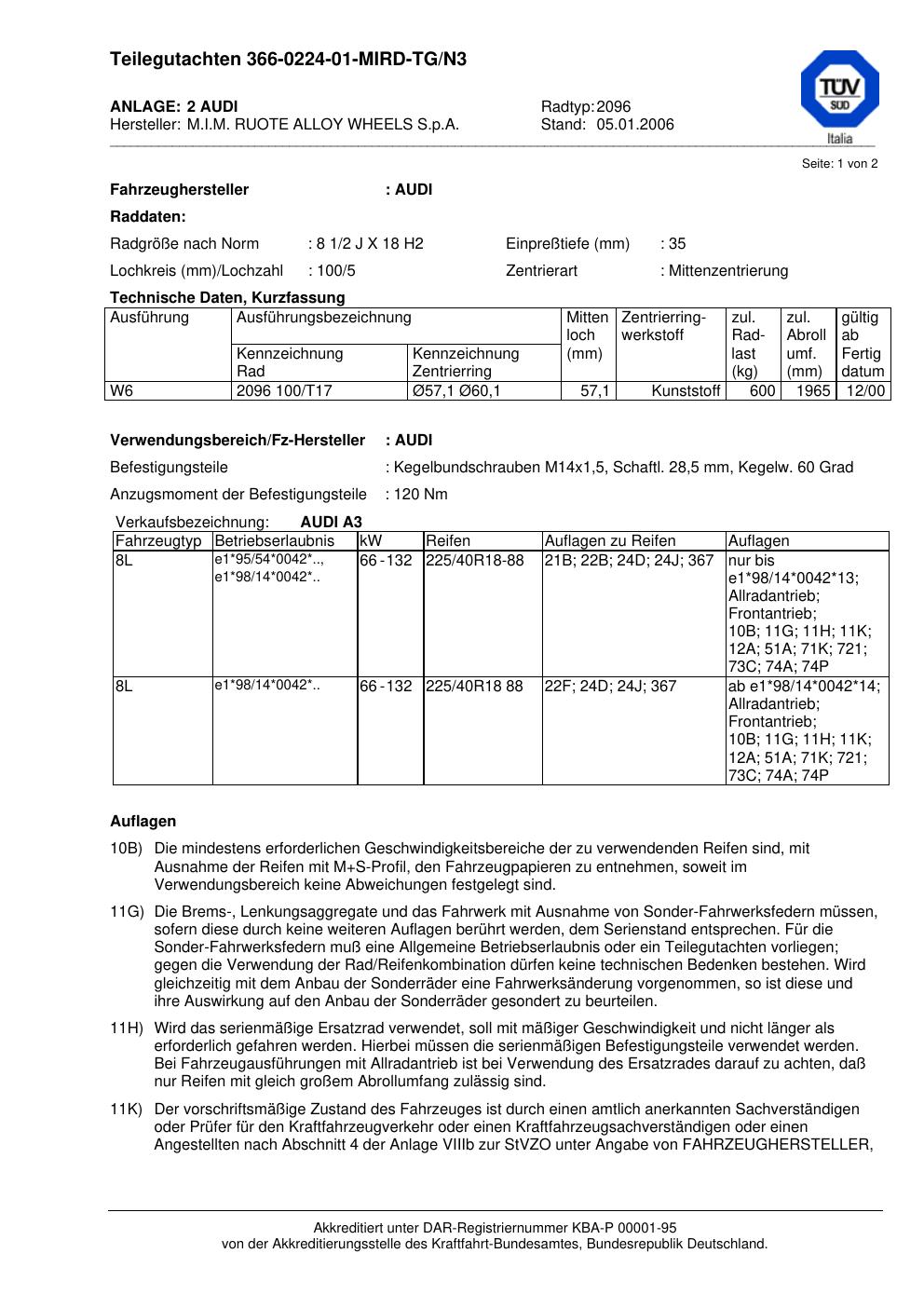 Dieses Gutachten (teilegutachten) bezieht sich auf die Alufelge MIM 2096 in der Ausführung ET 0, Mittenloch 0 mm . Im PDF findest du typischerweise zulässige Reifengrößen, Auflagen/Anbauhinweise und – je nach Dokument – Hinweise zur Eintragung.