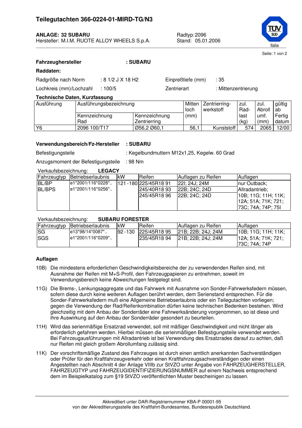 Dieses Gutachten (teilegutachten) bezieht sich auf die Alufelge MIM 2096 in der Ausführung ET 0, Mittenloch 0 mm . Im PDF findest du typischerweise zulässige Reifengrößen, Auflagen/Anbauhinweise und – je nach Dokument – Hinweise zur Eintragung.