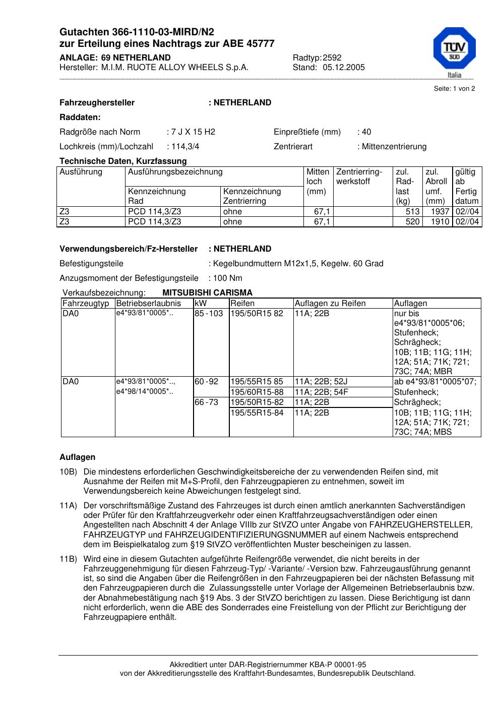 Felgengutachten / abe für Alufelgen M.I.M. RUOTE ALLOY WHEELS S.p.A. 2592 (ET 0, Mittenloch 0 mm) mit KBA 45777 (Zertifikatsnummer 45777). Hier kostenlos als PDF herunterladen. Der Download-Link ist 24 Stunden gültig und kann bis zu zwei Mal verwendet werden.