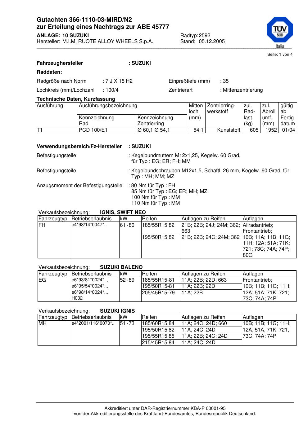 Dieses Gutachten (abe) bezieht sich auf die Alufelge M.I.M. RUOTE ALLOY WHEELS S.p.A. 2592 in der Ausführung ET 0, Mittenloch 0 mm (KBA 45777). Im PDF findest du typischerweise zulässige Reifengrößen, Auflagen/Anbauhinweise und – je nach Dokument – Hinweise zur Eintragung.