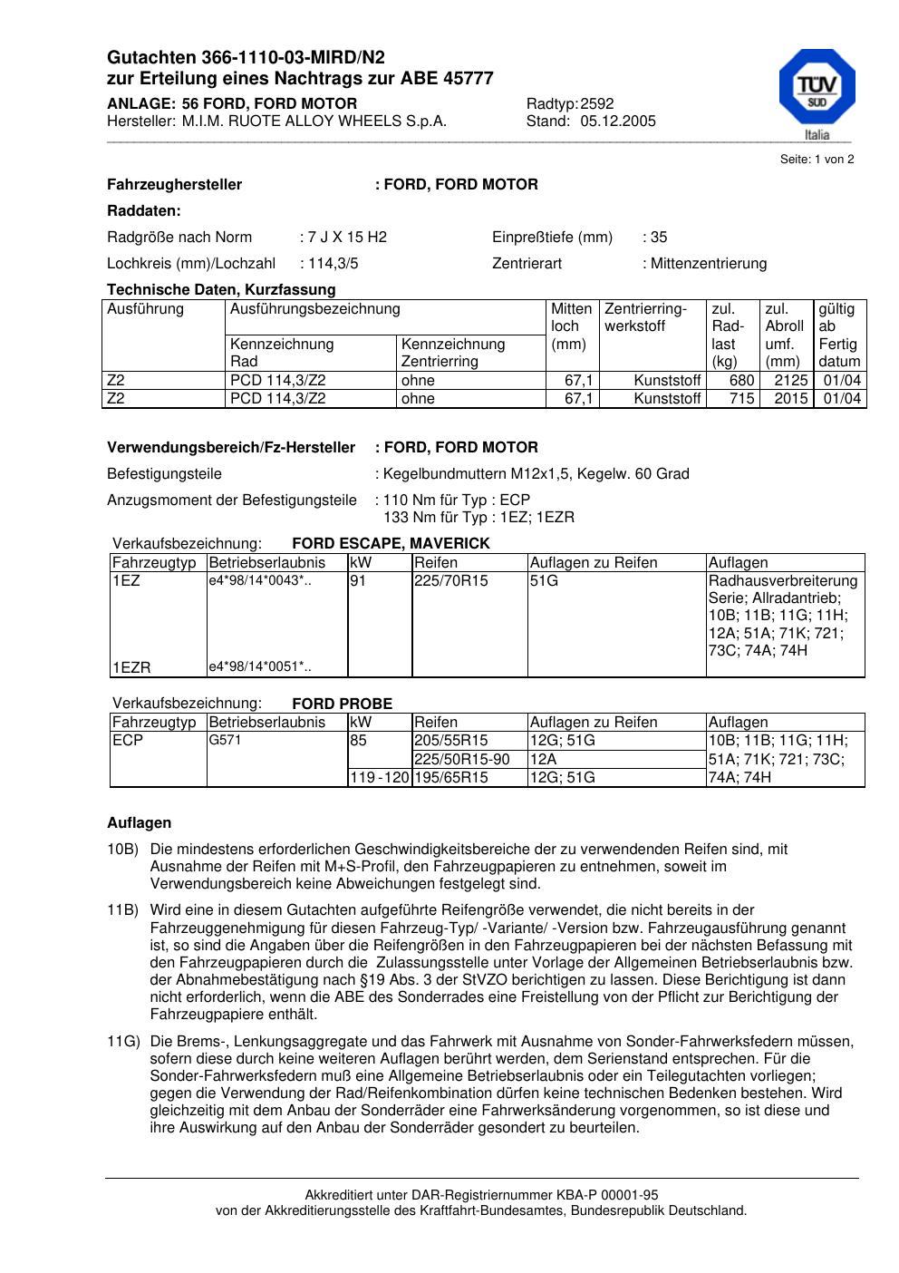 Dieses Gutachten (abe) bezieht sich auf die Alufelge M.I.M. RUOTE ALLOY WHEELS S.p.A. 2592 in der Ausführung ET 0, Mittenloch 0 mm (KBA 45777). Im PDF findest du typischerweise zulässige Reifengrößen, Auflagen/Anbauhinweise und – je nach Dokument – Hinweise zur Eintragung.