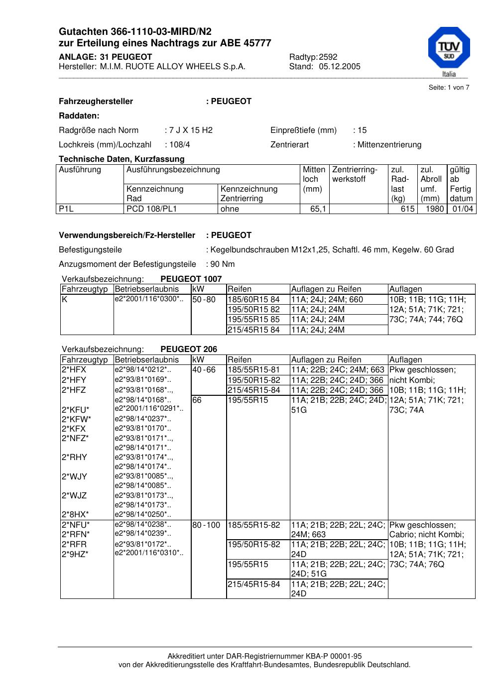 Dieses Gutachten (abe) bezieht sich auf die Alufelge M.I.M. RUOTE ALLOY WHEELS S.p.A. 2592 in der Ausführung ET 0, Mittenloch 0 mm (KBA 45777). Im PDF findest du typischerweise zulässige Reifengrößen, Auflagen/Anbauhinweise und – je nach Dokument – Hinweise zur Eintragung.