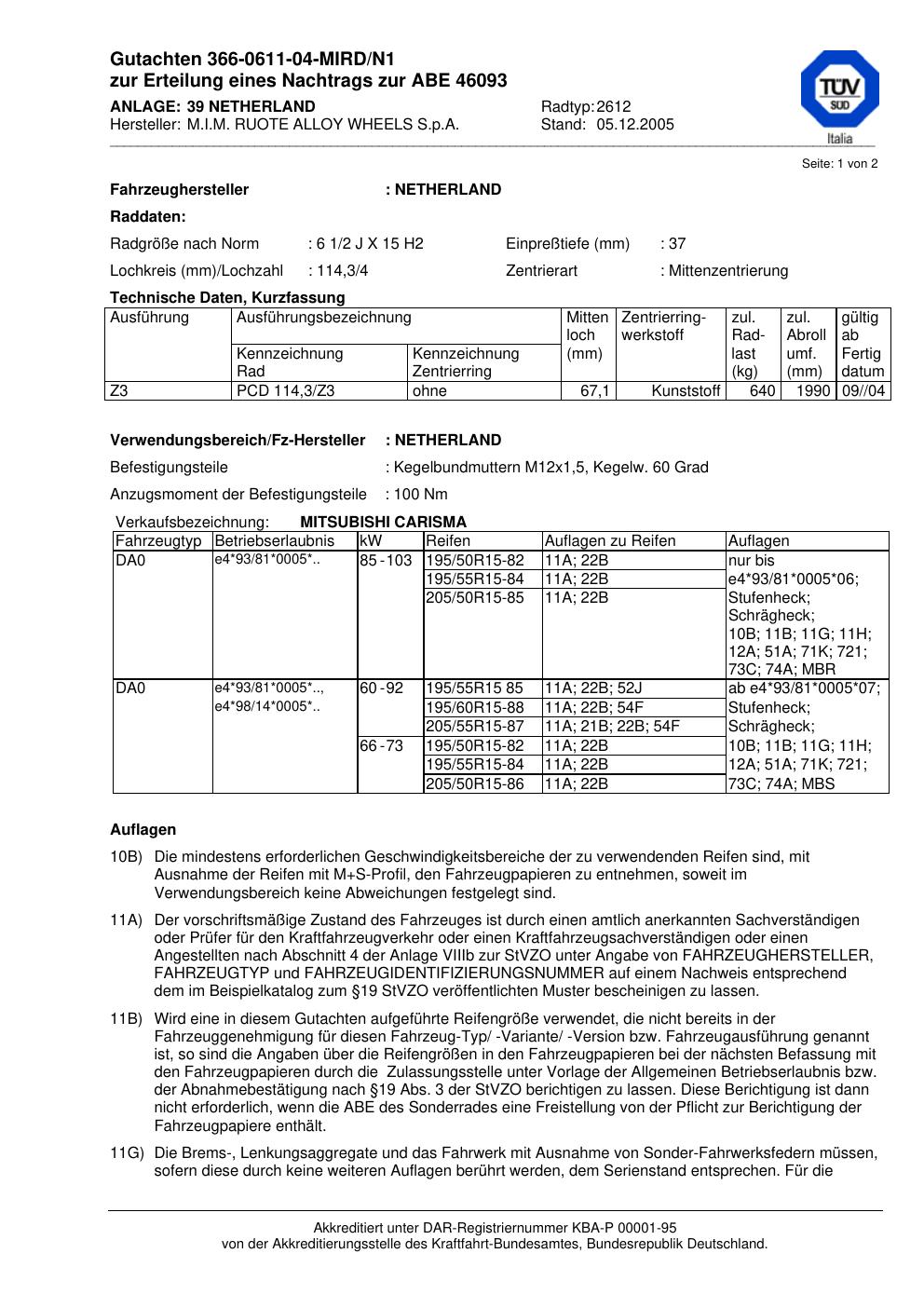 Dieses Gutachten (abe) bezieht sich auf die Alufelge M.I.M. RUOTE ALLOY WHEELS S.p.A. 2612 in der Ausführung ET 0, Mittenloch 0 mm (KBA 46093). Im PDF findest du typischerweise zulässige Reifengrößen, Auflagen/Anbauhinweise und – je nach Dokument – Hinweise zur Eintragung.