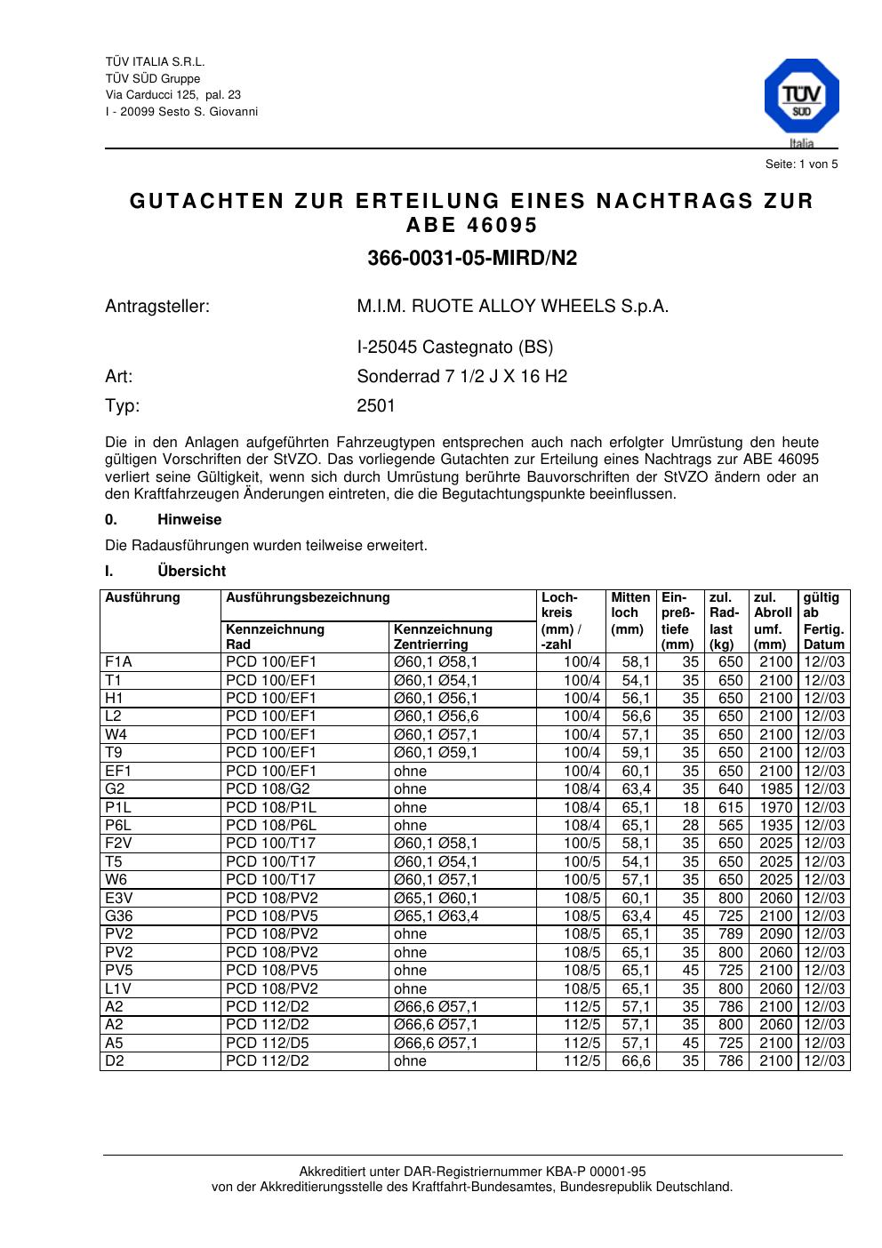 Dieses Gutachten (abe) bezieht sich auf die Alufelge M.I.M. RUOTE ALLOY WHEELS S.p.A. 2501 in der Ausführung ET 0, Mittenloch 0 mm (KBA 46095). Im PDF findest du typischerweise zulässige Reifengrößen, Auflagen/Anbauhinweise und – je nach Dokument – Hinweise zur Eintragung.