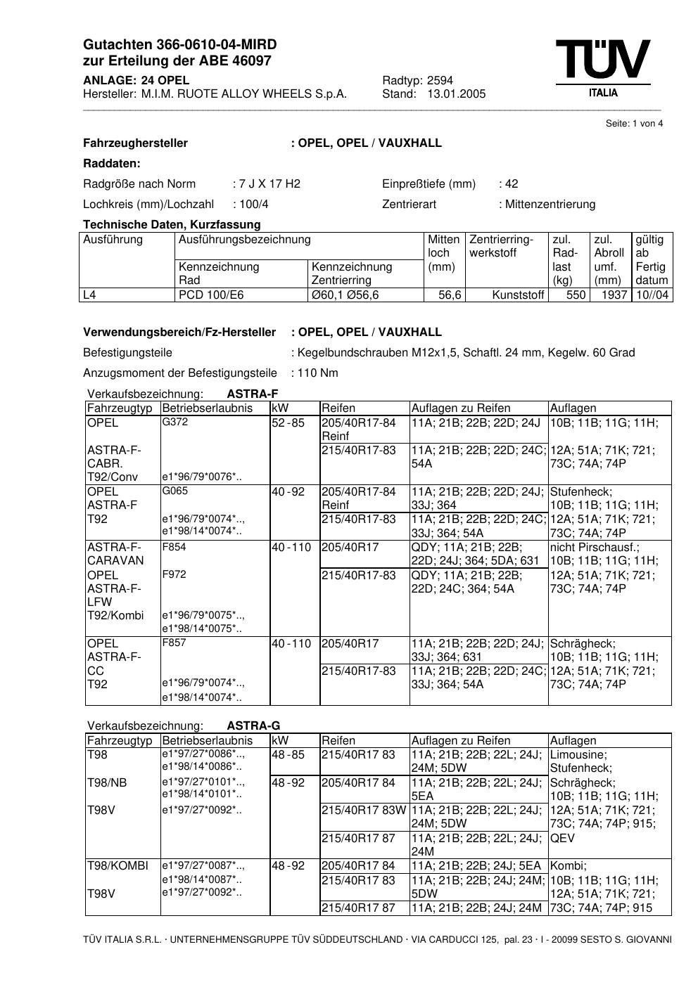 Dieses Gutachten (abe) bezieht sich auf die Alufelge M.I.M. RUOTE ALLOY WHEELS S.p.A. 2594 in der Ausführung ET 0, Mittenloch 0 mm (KBA 46097). Im PDF findest du typischerweise zulässige Reifengrößen, Auflagen/Anbauhinweise und – je nach Dokument – Hinweise zur Eintragung.