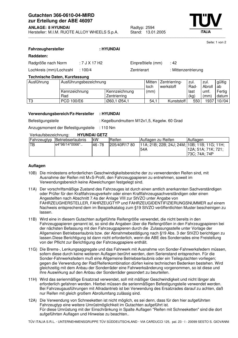 Felgengutachten / abe für Alufelgen M.I.M. RUOTE ALLOY WHEELS S.p.A. 2594 (ET 0, Mittenloch 0 mm) mit KBA 46097 (Zertifikatsnummer 46097). Hier kostenlos als PDF herunterladen. Der Download-Link ist 24 Stunden gültig und kann bis zu zwei Mal verwendet werden.