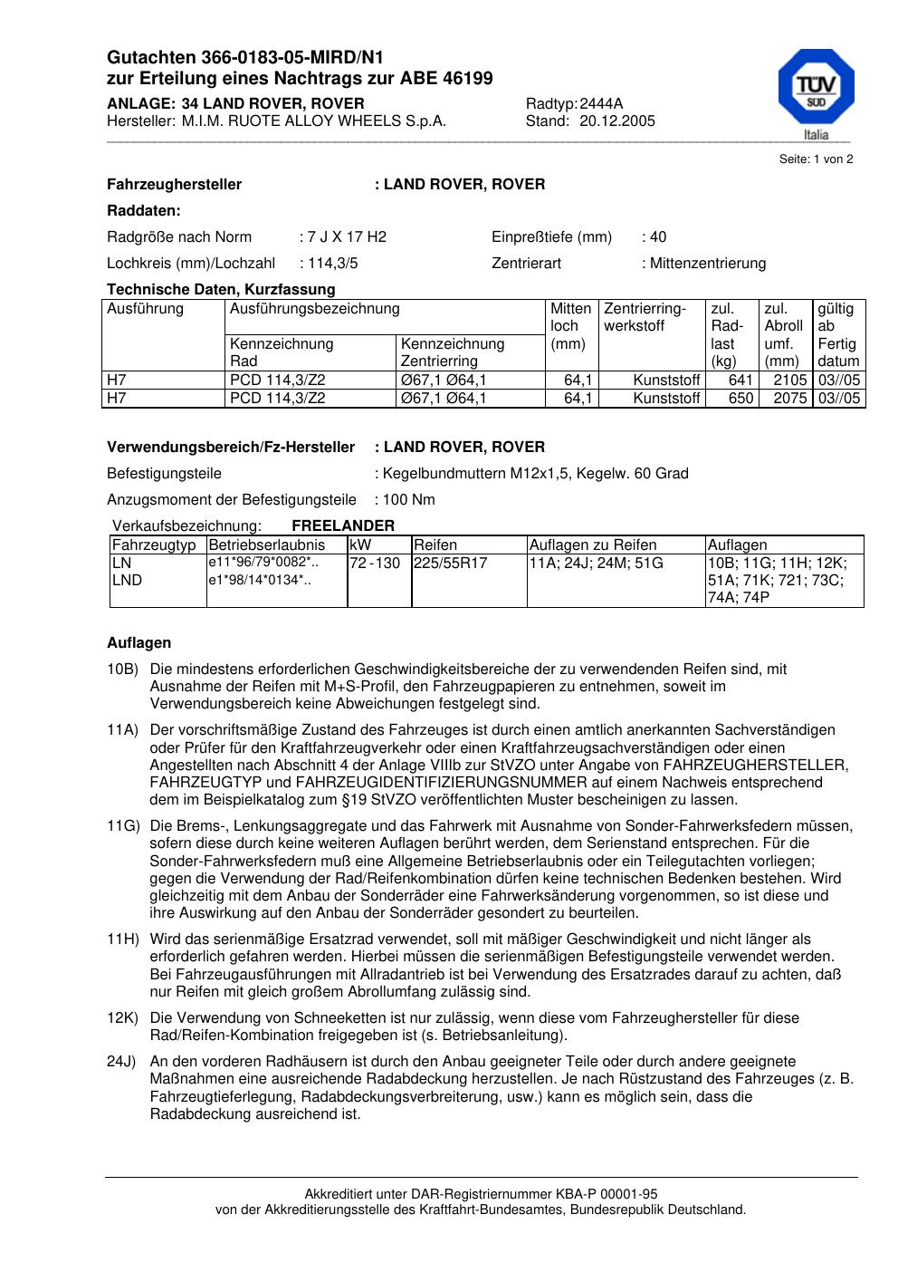 Dieses Gutachten (abe) bezieht sich auf die Alufelge M.I.M. RUOTE ALLOY WHEELS S.p.A. 2444A in der Ausführung ET 0, Mittenloch 0 mm (KBA 46199). Im PDF findest du typischerweise zulässige Reifengrößen, Auflagen/Anbauhinweise und – je nach Dokument – Hinweise zur Eintragung.