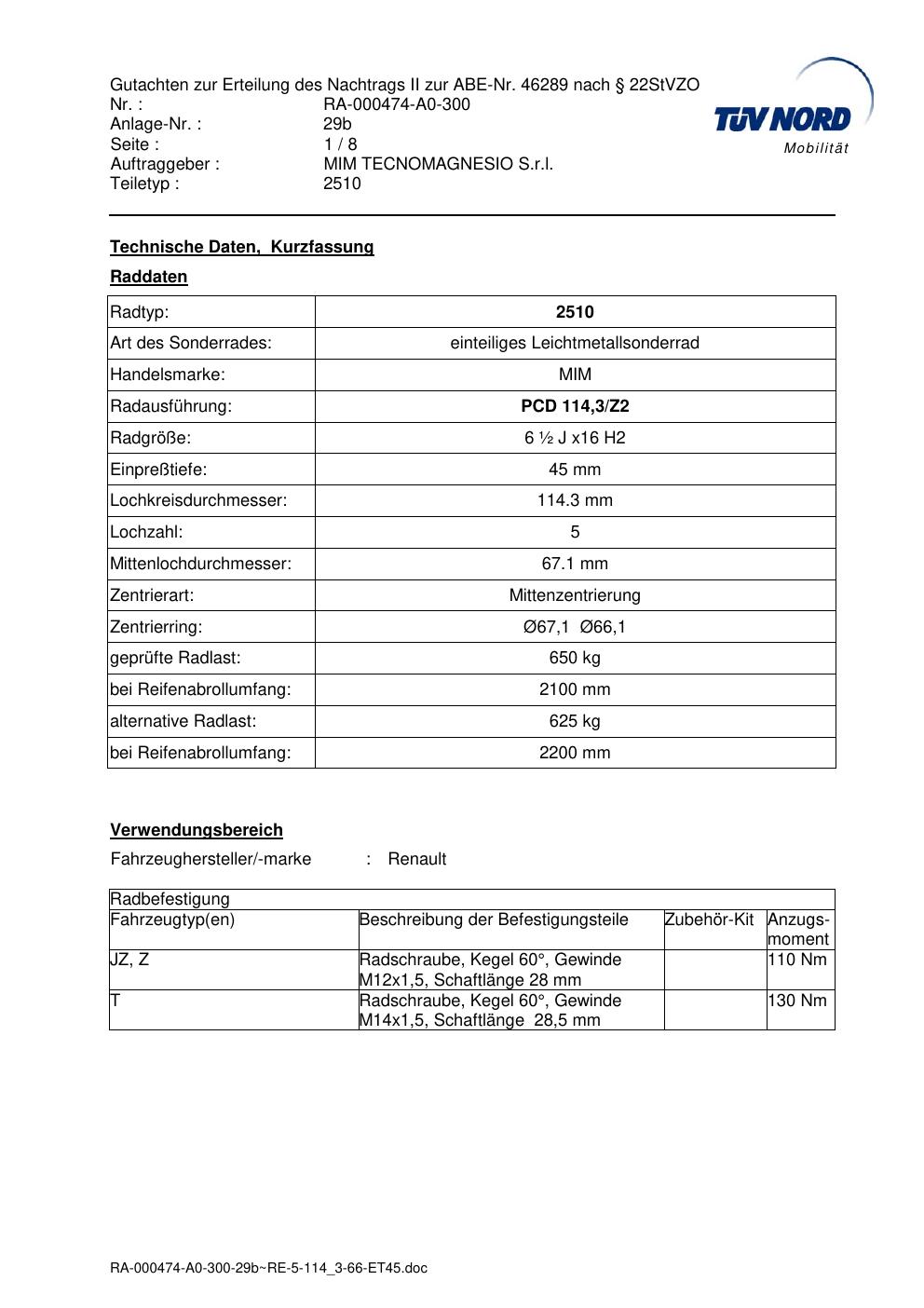 Dieses Gutachten (abe) bezieht sich auf die Alufelge MIM 2510 in der Ausführung ET 0, Mittenloch 0 mm (KBA 46289). Im PDF findest du typischerweise zulässige Reifengrößen, Auflagen/Anbauhinweise und – je nach Dokument – Hinweise zur Eintragung.