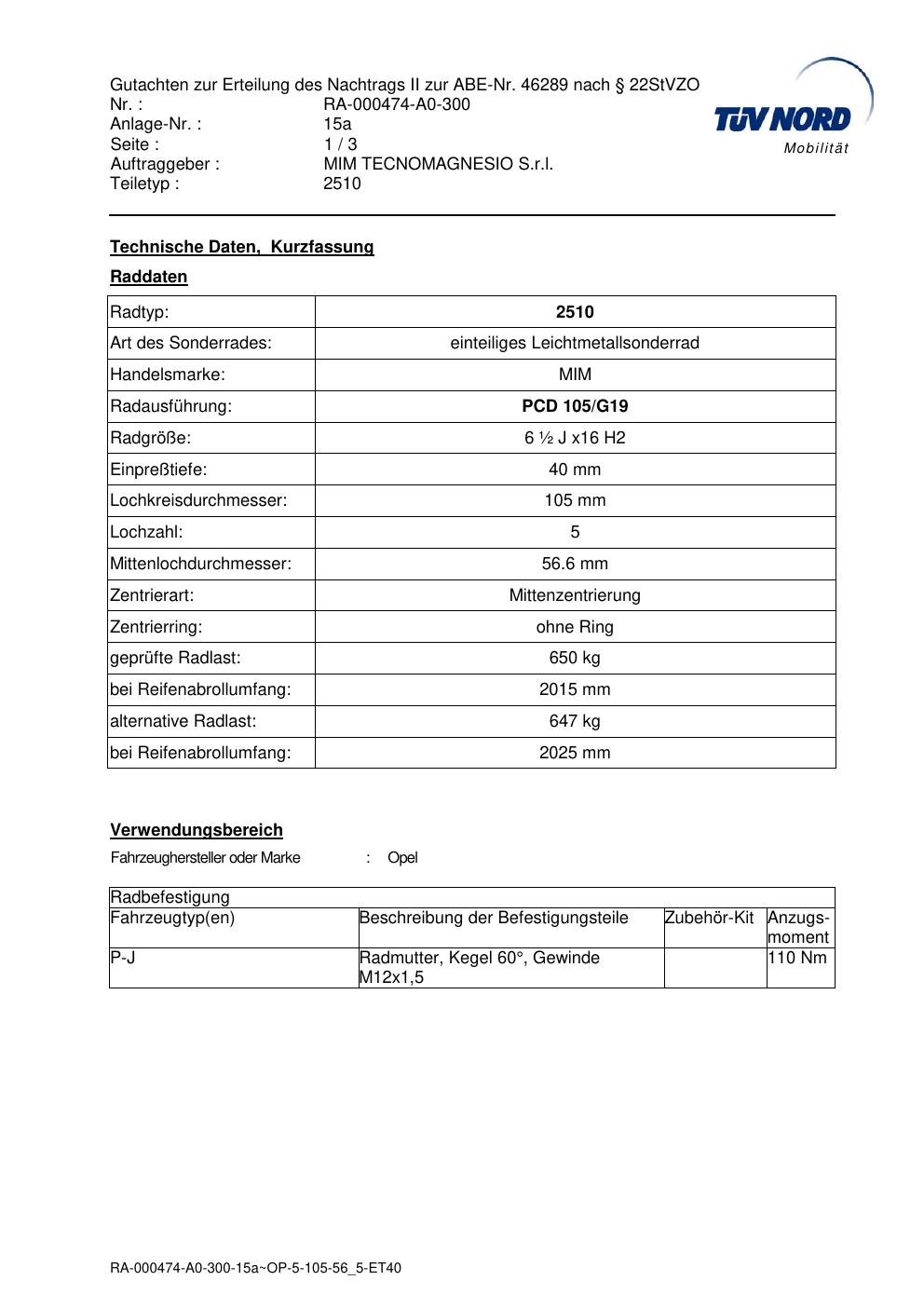 Dieses Gutachten (abe) bezieht sich auf die Alufelge MIM TECNOMAGNESIO S.r.l. (Handelsmarke: MIM) 2510 in der Ausführung ET 0, Mittenloch 0 mm (KBA 46289). Im PDF findest du typischerweise zulässige Reifengrößen, Auflagen/Anbauhinweise und – je nach Dokument – Hinweise zur Eintragung.