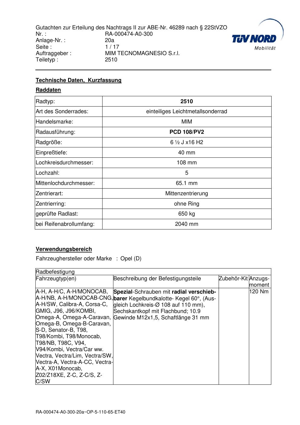 Dieses Gutachten (abe) bezieht sich auf die Alufelge MIM 2510 in der Ausführung ET 0, Mittenloch 0 mm (KBA 46289). Im PDF findest du typischerweise zulässige Reifengrößen, Auflagen/Anbauhinweise und – je nach Dokument – Hinweise zur Eintragung.