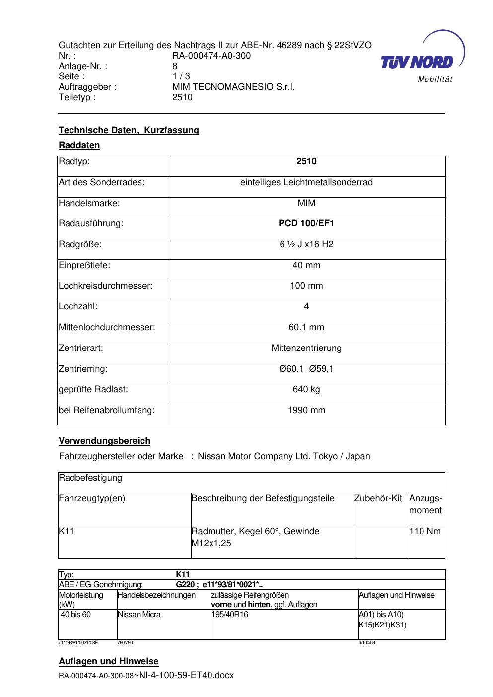 Dieses Gutachten (abe) bezieht sich auf die Alufelge MIM 2510 in der Ausführung ET 0, Mittenloch 0 mm (KBA 46289). Im PDF findest du typischerweise zulässige Reifengrößen, Auflagen/Anbauhinweise und – je nach Dokument – Hinweise zur Eintragung.