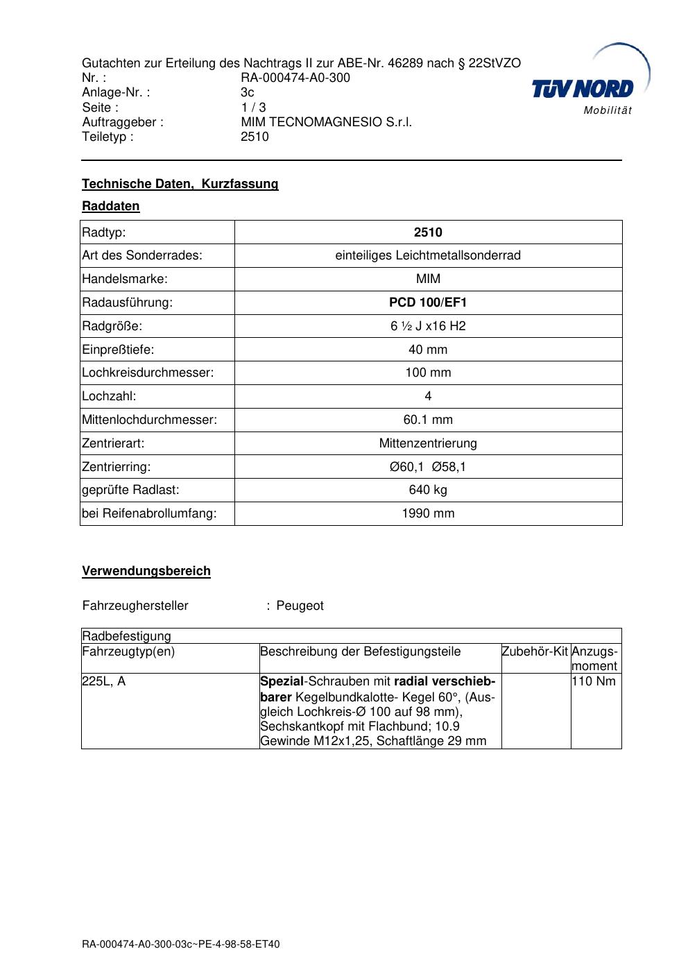 Dieses Gutachten (abe) bezieht sich auf die Alufelge MIM 2510 in der Ausführung ET 0, Mittenloch 0 mm (KBA 46289). Im PDF findest du typischerweise zulässige Reifengrößen, Auflagen/Anbauhinweise und – je nach Dokument – Hinweise zur Eintragung.