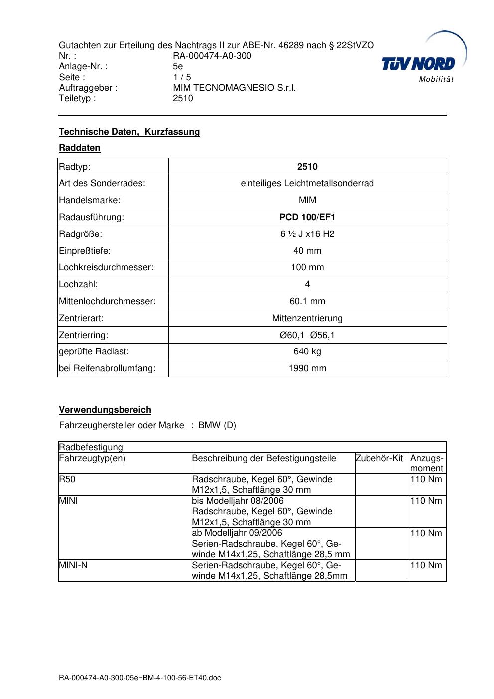Dieses Gutachten (abe) bezieht sich auf die Alufelge MIM 2510 in der Ausführung ET 0, Mittenloch 0 mm (KBA 46289). Im PDF findest du typischerweise zulässige Reifengrößen, Auflagen/Anbauhinweise und – je nach Dokument – Hinweise zur Eintragung.