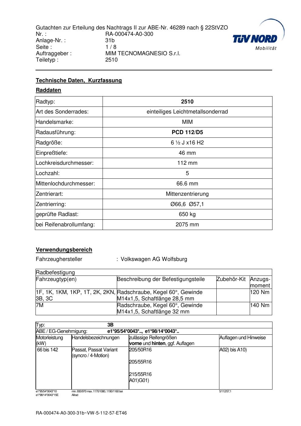 Dieses Gutachten (abe) bezieht sich auf die Alufelge MIM 2510 in der Ausführung ET 0, Mittenloch 0 mm (KBA 46289). Im PDF findest du typischerweise zulässige Reifengrößen, Auflagen/Anbauhinweise und – je nach Dokument – Hinweise zur Eintragung.