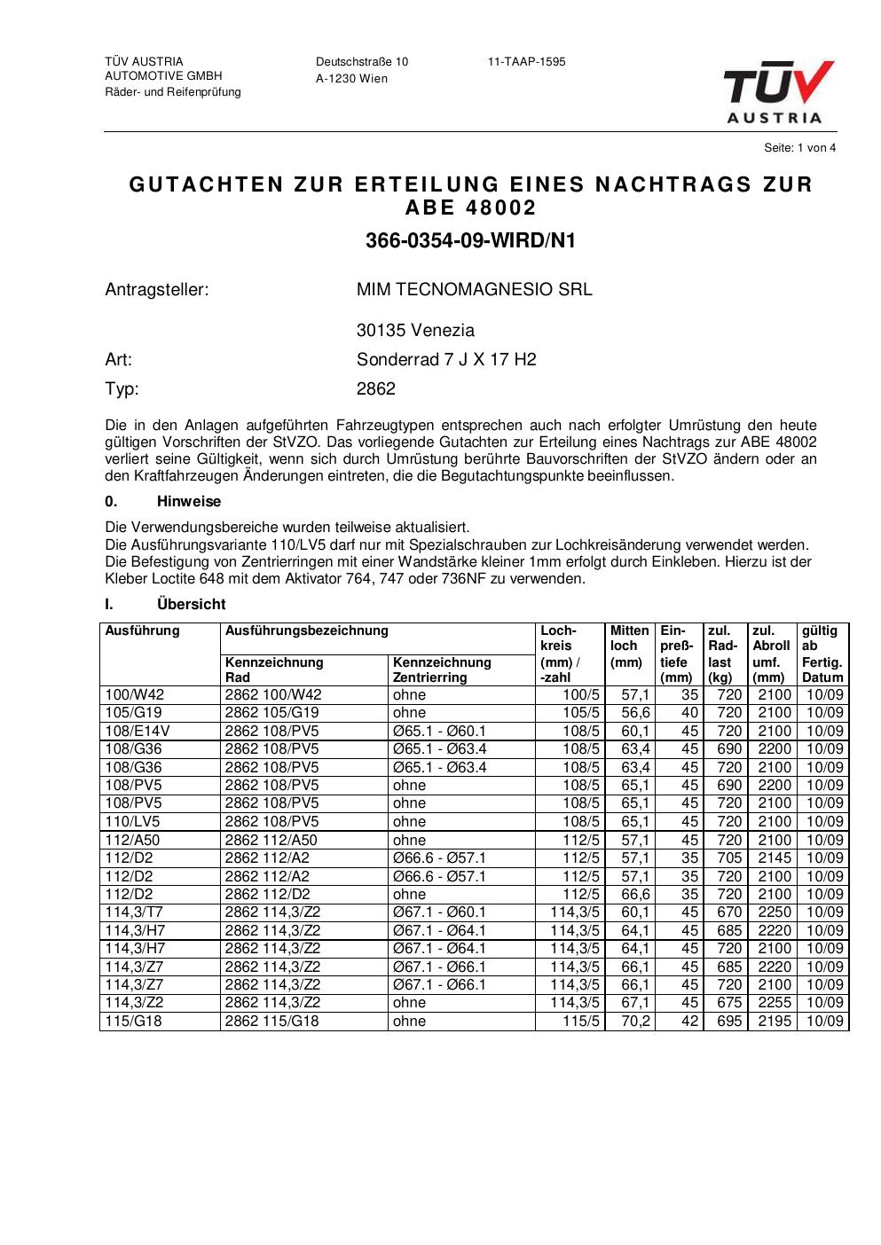 Dieses abe der Marke MIM stammt vom jeweiligen Hersteller, Importeur oder einer Prüforganisation. Felgengutachten.de beansprucht hieran keine eigenen Urheber-, Nutzungs- oder sonstigen Schutzrechte. Soweit das Dokument urheber- oder leistungsschutzrechtlich geschützt ist, verbleiben die Rechte beim jeweiligen Rechteinhaber. Die Bereitstellung erfolgt ausschließlich zu Informationszwecken für Endnutzer, z. B. zur Vorlage bei Prüfstellen oder zur eigenen Fahrzeugdokumentation.