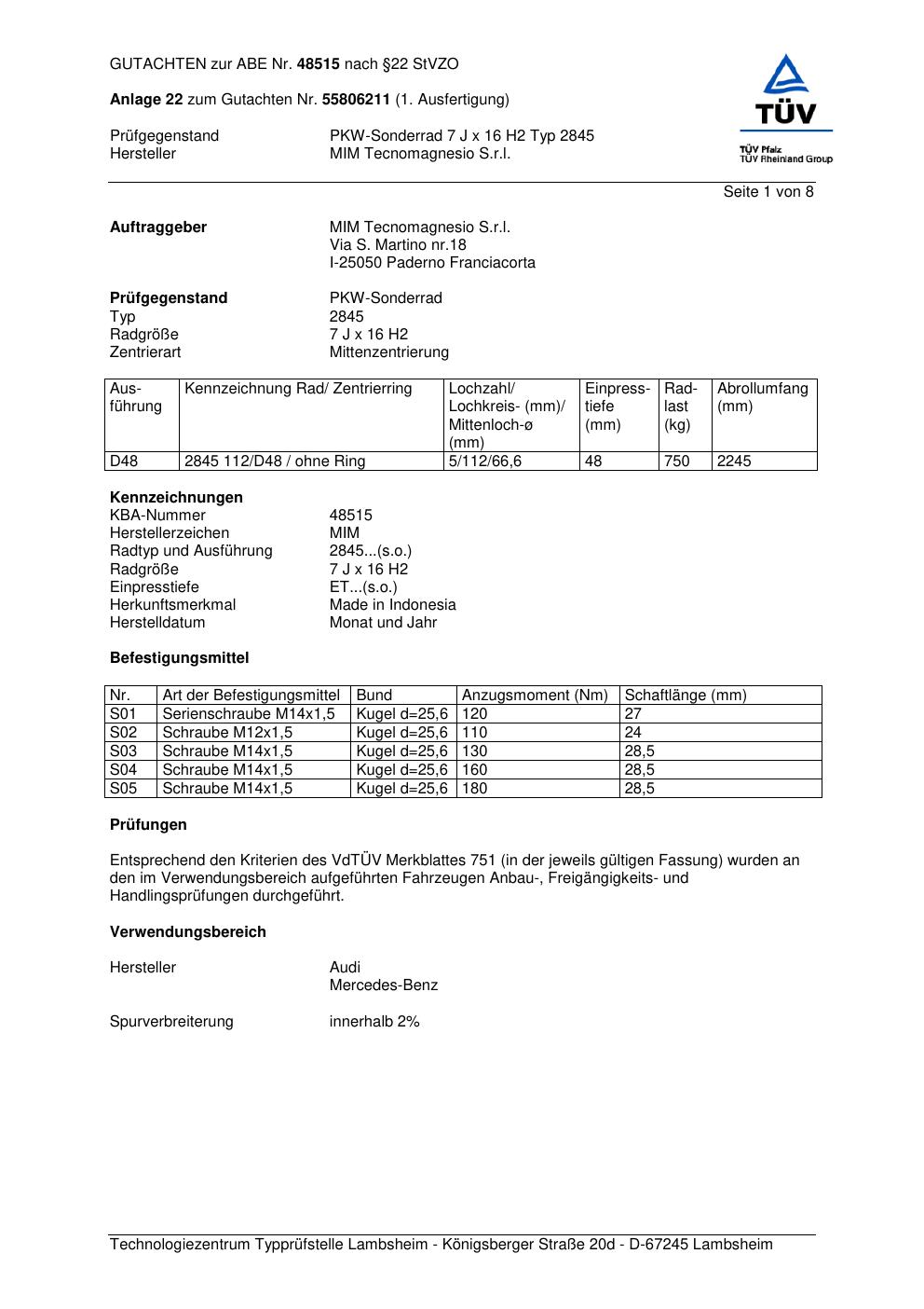 Dieses Gutachten (abe) bezieht sich auf die Alufelge MIM Tecnomagnesio S.r.l. 2845 in der Ausführung ET 0, Mittenloch 0 mm (KBA 48515). Im PDF findest du typischerweise zulässige Reifengrößen, Auflagen/Anbauhinweise und – je nach Dokument – Hinweise zur Eintragung.