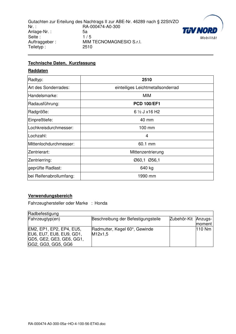 Dieses Gutachten (abe) bezieht sich auf die Alufelge MIM 2510 in der Ausführung ET 0, Mittenloch 0 mm (KBA 46289). Im PDF findest du typischerweise zulässige Reifengrößen, Auflagen/Anbauhinweise und – je nach Dokument – Hinweise zur Eintragung.