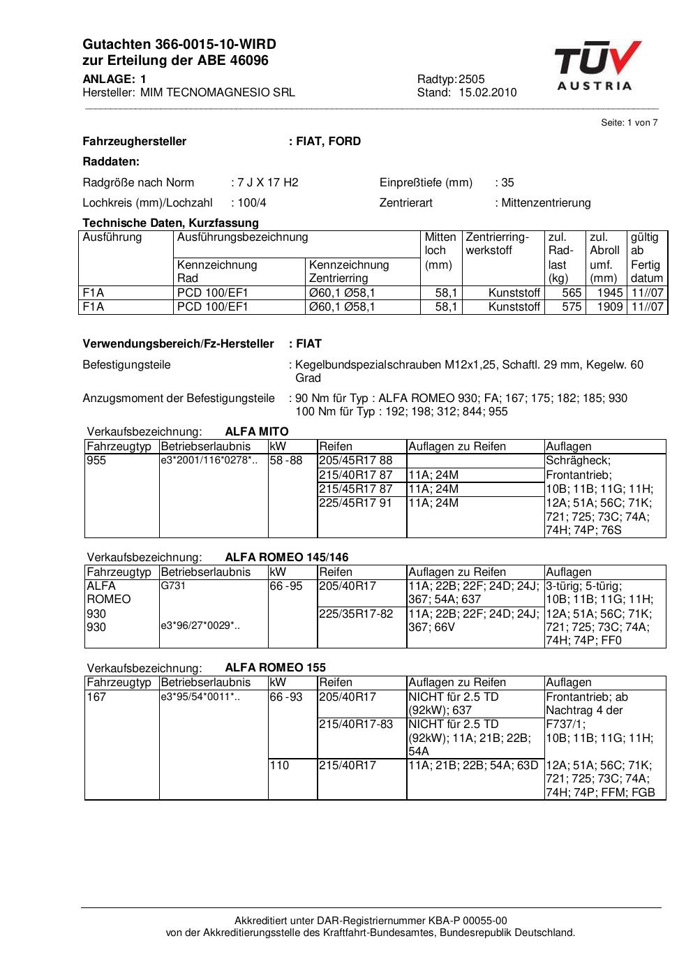 Dieses Gutachten (abe) bezieht sich auf die Alufelge MIM 2505 in der Ausführung ET 0, Mittenloch 0 mm (KBA 46096). Im PDF findest du typischerweise zulässige Reifengrößen, Auflagen/Anbauhinweise und – je nach Dokument – Hinweise zur Eintragung.