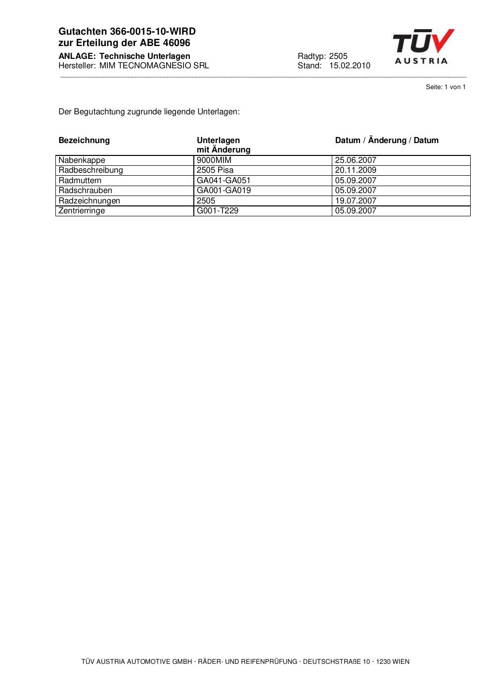 Dieses Gutachten (abe) bezieht sich auf die Alufelge MIM 2505 in der Ausführung ET 0, Mittenloch 0 mm (KBA 46096). Im PDF findest du typischerweise zulässige Reifengrößen, Auflagen/Anbauhinweise und – je nach Dokument – Hinweise zur Eintragung.