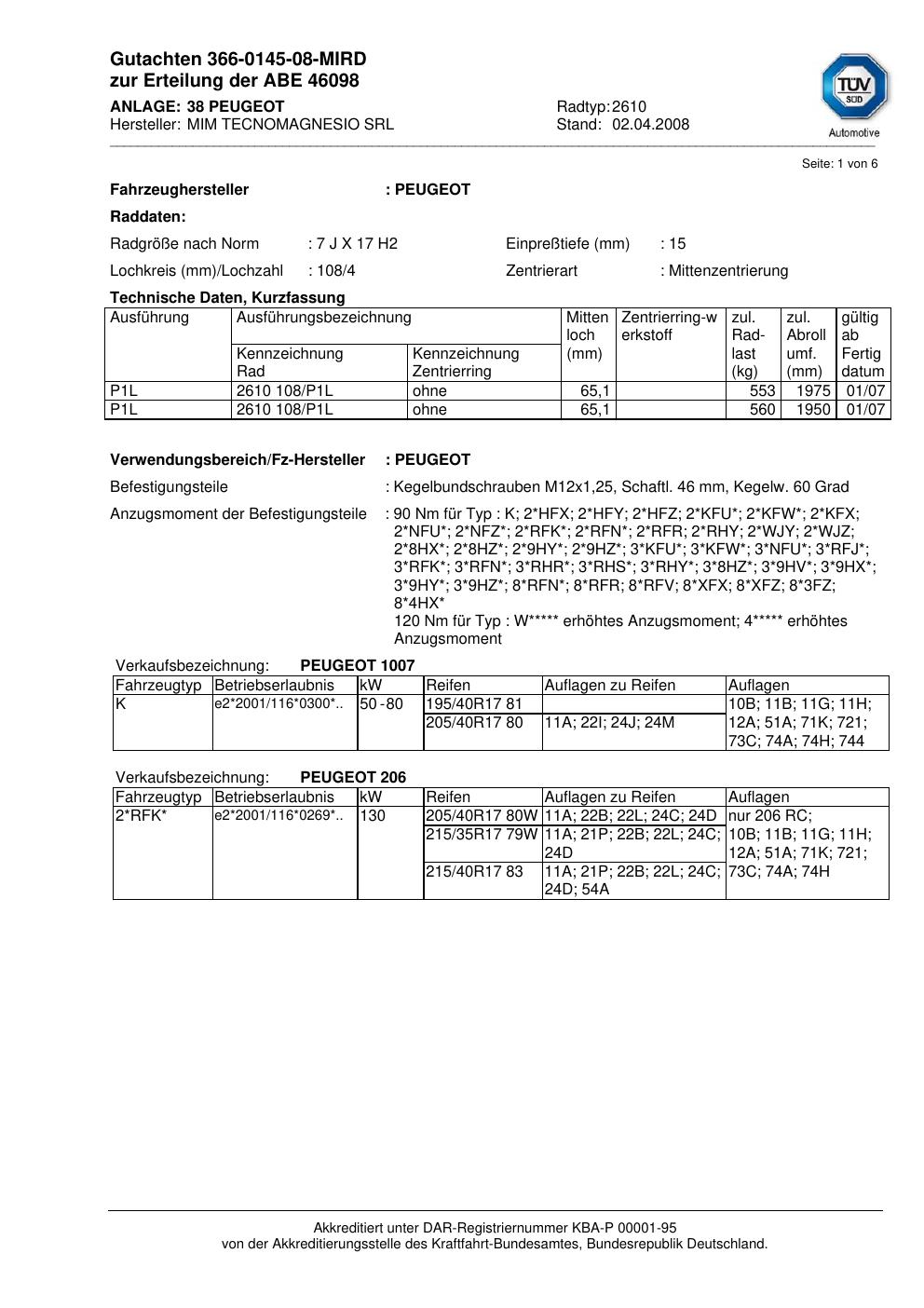 Dieses Gutachten (abe) bezieht sich auf die Alufelge MIM 2610 in der Ausführung ET 0, Mittenloch 0 mm (KBA 46098). Im PDF findest du typischerweise zulässige Reifengrößen, Auflagen/Anbauhinweise und – je nach Dokument – Hinweise zur Eintragung.