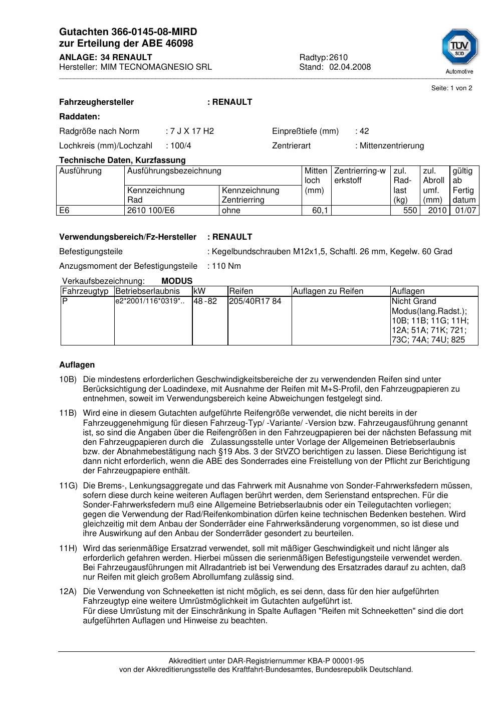 Dieses Gutachten (abe) bezieht sich auf die Alufelge MIM 2610 in der Ausführung ET 0, Mittenloch 0 mm (KBA 46098). Im PDF findest du typischerweise zulässige Reifengrößen, Auflagen/Anbauhinweise und – je nach Dokument – Hinweise zur Eintragung.