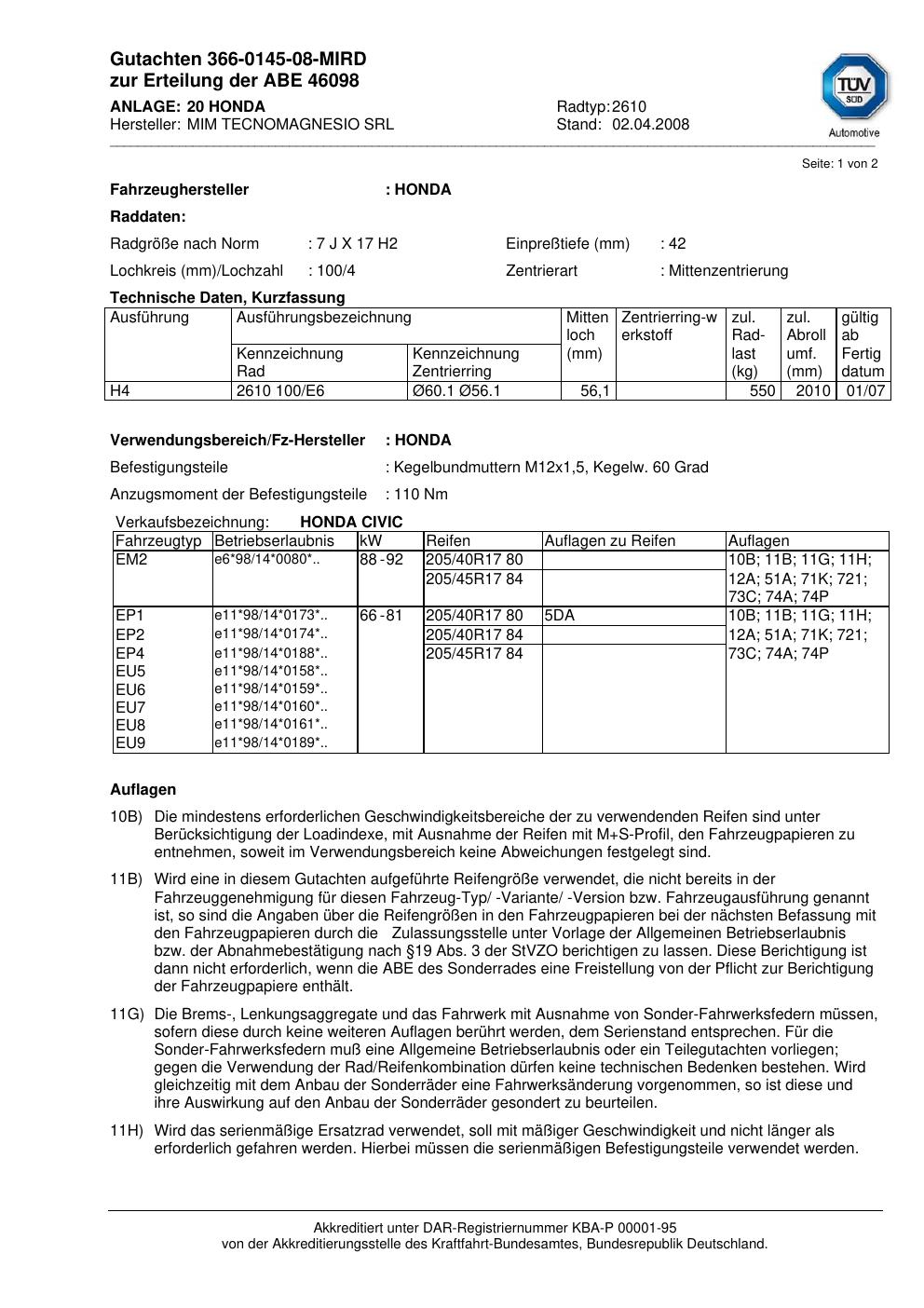 Dieses Gutachten (abe) bezieht sich auf die Alufelge MIM 2610 in der Ausführung ET 0, Mittenloch 0 mm (KBA 46098). Im PDF findest du typischerweise zulässige Reifengrößen, Auflagen/Anbauhinweise und – je nach Dokument – Hinweise zur Eintragung.