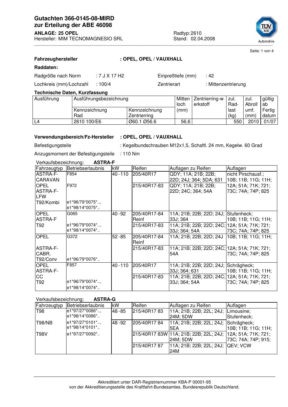 Dieses Gutachten (abe) bezieht sich auf die Alufelge MIM 2610 in der Ausführung ET 0, Mittenloch 0 mm (KBA 46098). Im PDF findest du typischerweise zulässige Reifengrößen, Auflagen/Anbauhinweise und – je nach Dokument – Hinweise zur Eintragung.
