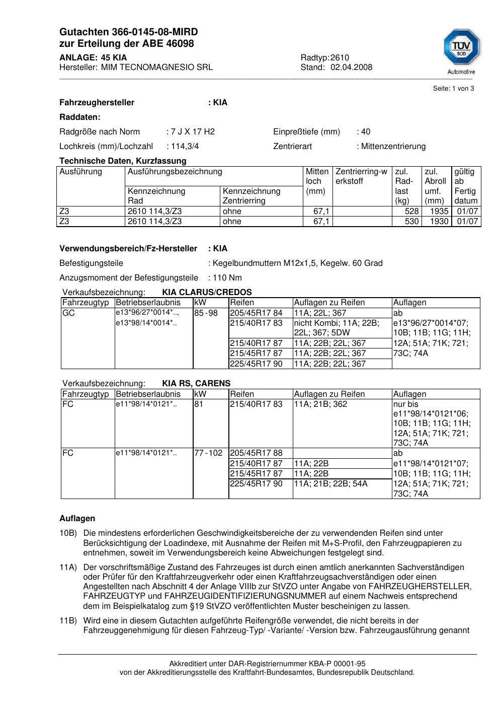 Dieses Gutachten (abe) bezieht sich auf die Alufelge MIM 2610 in der Ausführung ET 0, Mittenloch 0 mm (KBA 46098). Im PDF findest du typischerweise zulässige Reifengrößen, Auflagen/Anbauhinweise und – je nach Dokument – Hinweise zur Eintragung.