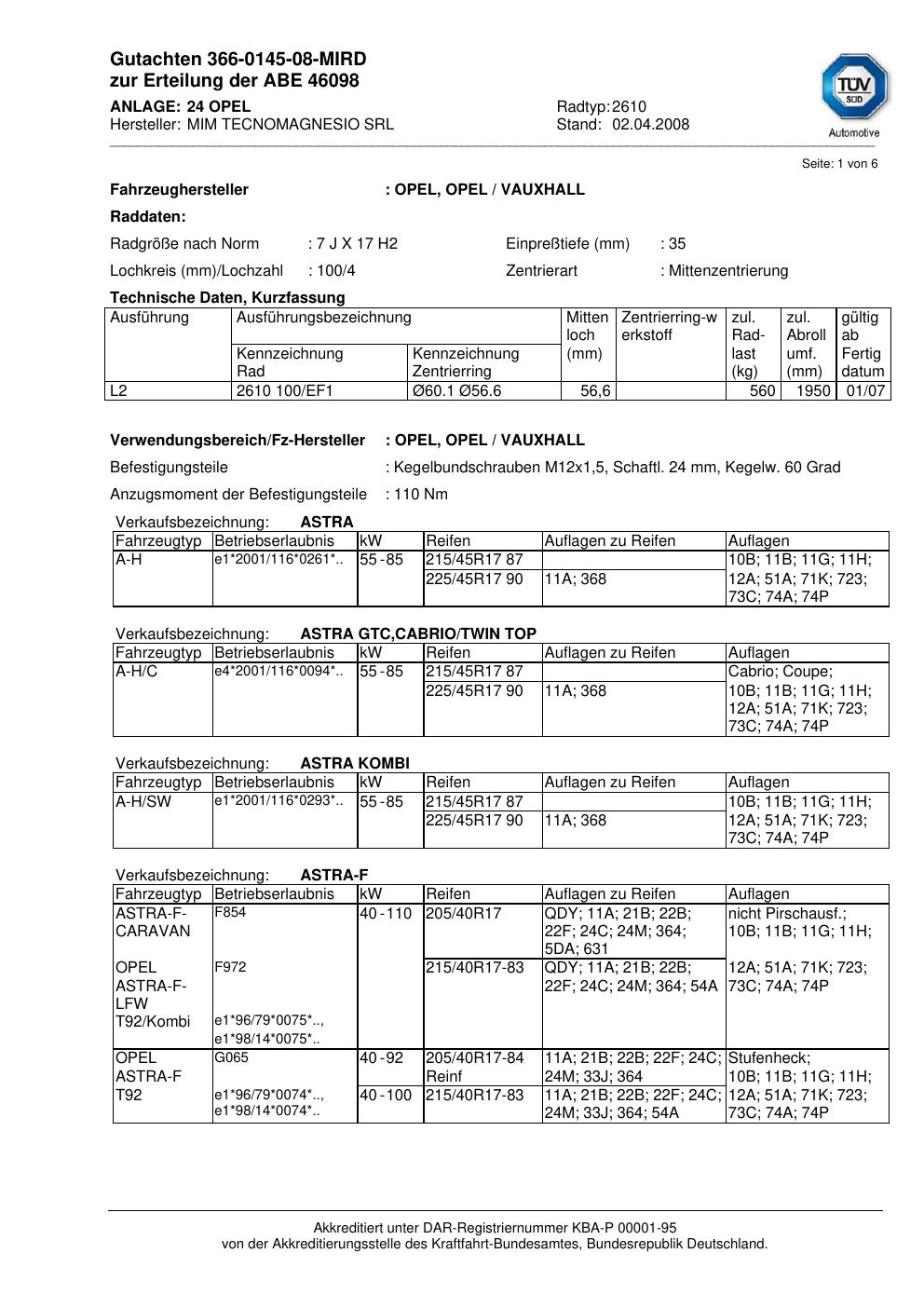 Dieses Gutachten (abe) bezieht sich auf die Alufelge MIM 2610 in der Ausführung ET 0, Mittenloch 0 mm (KBA 46098). Im PDF findest du typischerweise zulässige Reifengrößen, Auflagen/Anbauhinweise und – je nach Dokument – Hinweise zur Eintragung.