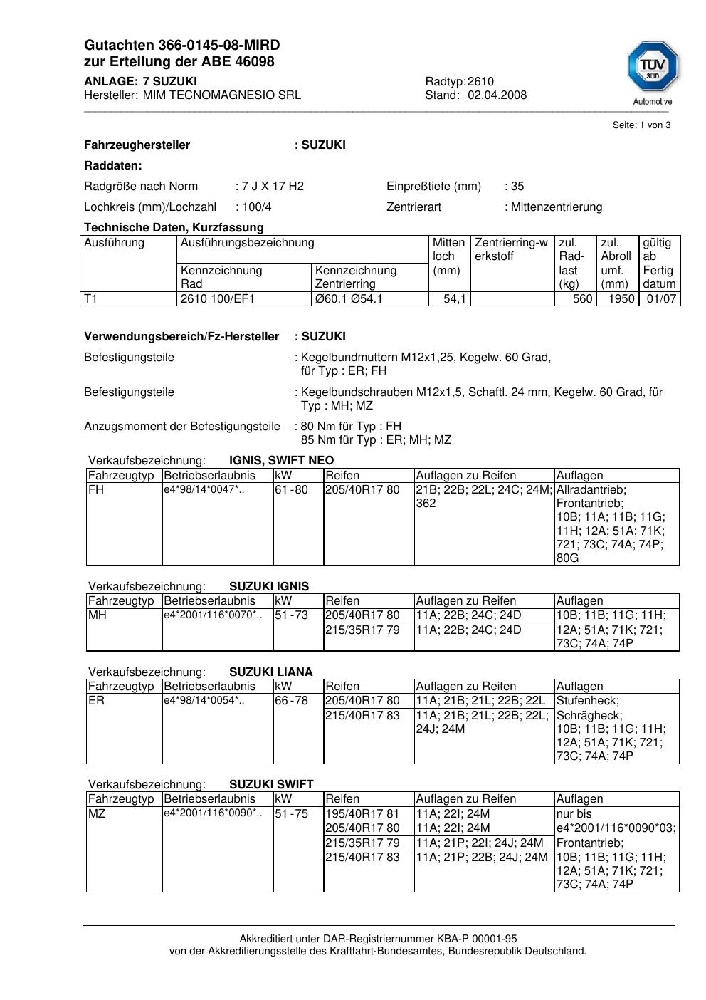 Dieses Gutachten (abe) bezieht sich auf die Alufelge MIM 2610 in der Ausführung ET 0, Mittenloch 0 mm (KBA 46098). Im PDF findest du typischerweise zulässige Reifengrößen, Auflagen/Anbauhinweise und – je nach Dokument – Hinweise zur Eintragung.