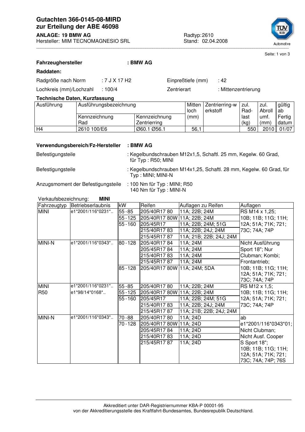 Dieses Gutachten (abe) bezieht sich auf die Alufelge MIM 2610 in der Ausführung ET 0, Mittenloch 0 mm (KBA 46098). Im PDF findest du typischerweise zulässige Reifengrößen, Auflagen/Anbauhinweise und – je nach Dokument – Hinweise zur Eintragung.