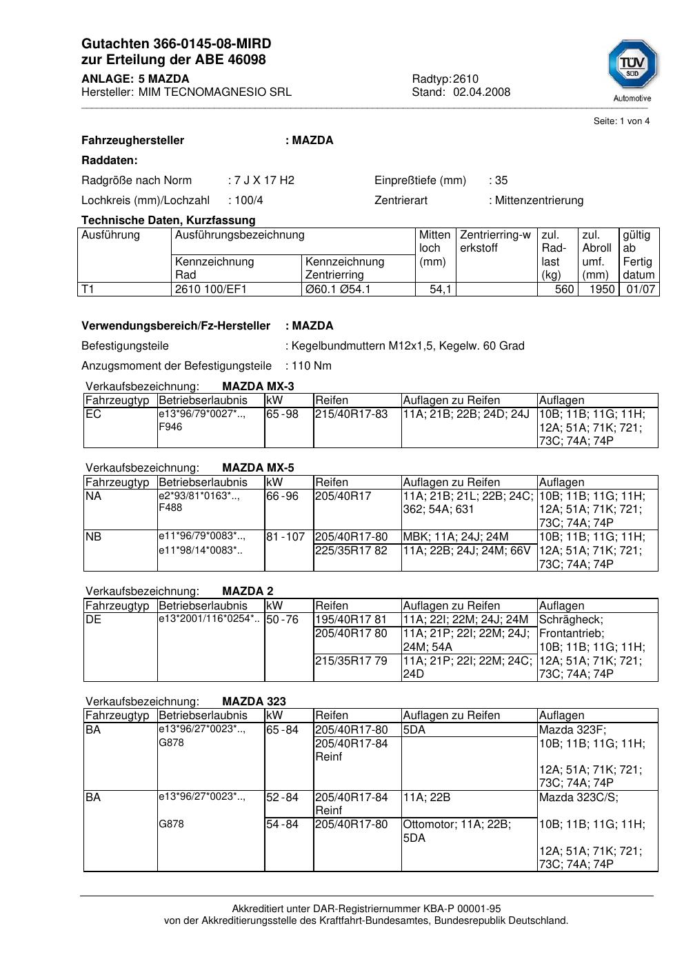 Dieses Gutachten (abe) bezieht sich auf die Alufelge MIM 2610 in der Ausführung ET 0, Mittenloch 0 mm (KBA 46098). Im PDF findest du typischerweise zulässige Reifengrößen, Auflagen/Anbauhinweise und – je nach Dokument – Hinweise zur Eintragung.