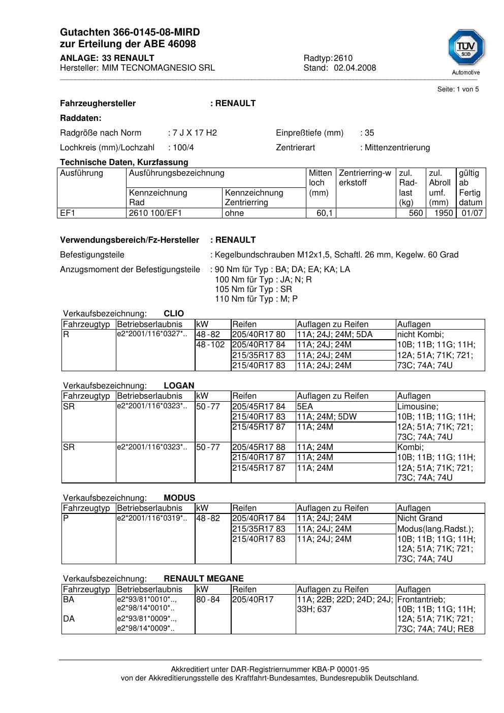 Dieses Gutachten (abe) bezieht sich auf die Alufelge MIM 2610 in der Ausführung ET 0, Mittenloch 0 mm (KBA 46098). Im PDF findest du typischerweise zulässige Reifengrößen, Auflagen/Anbauhinweise und – je nach Dokument – Hinweise zur Eintragung.