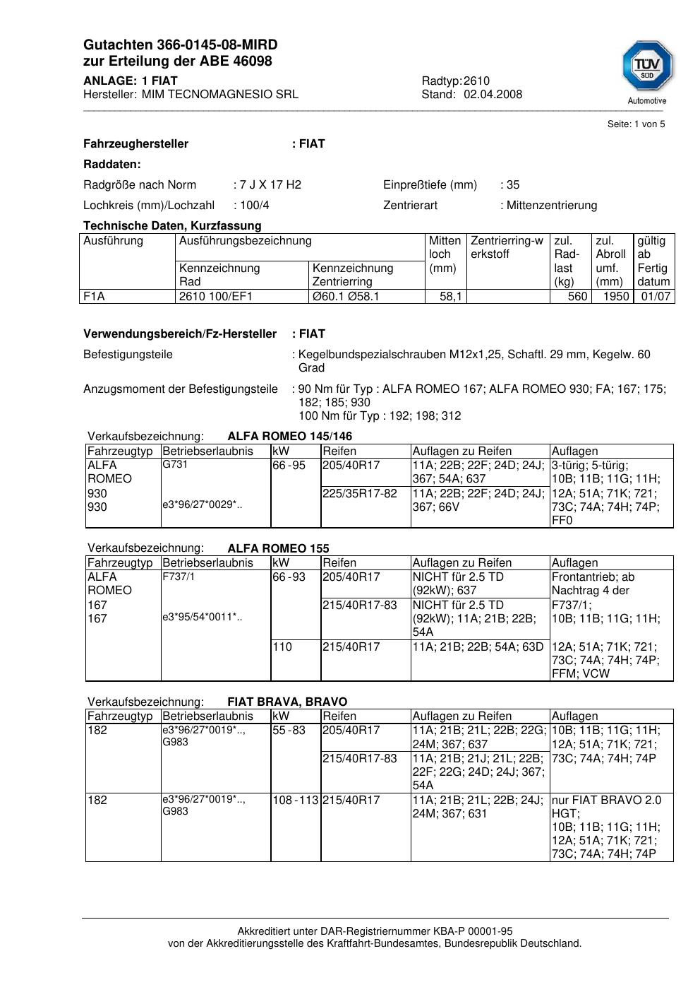 Dieses Gutachten (abe) bezieht sich auf die Alufelge MIM 2610 in der Ausführung ET 0, Mittenloch 0 mm (KBA 46098). Im PDF findest du typischerweise zulässige Reifengrößen, Auflagen/Anbauhinweise und – je nach Dokument – Hinweise zur Eintragung.