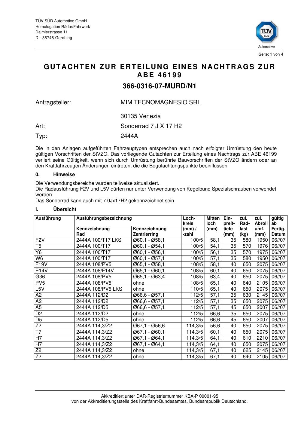 Dieses Gutachten (abe) bezieht sich auf die Alufelge MIM 2444A in der Ausführung ET 0, Mittenloch 0 mm (KBA 46199). Im PDF findest du typischerweise zulässige Reifengrößen, Auflagen/Anbauhinweise und – je nach Dokument – Hinweise zur Eintragung.