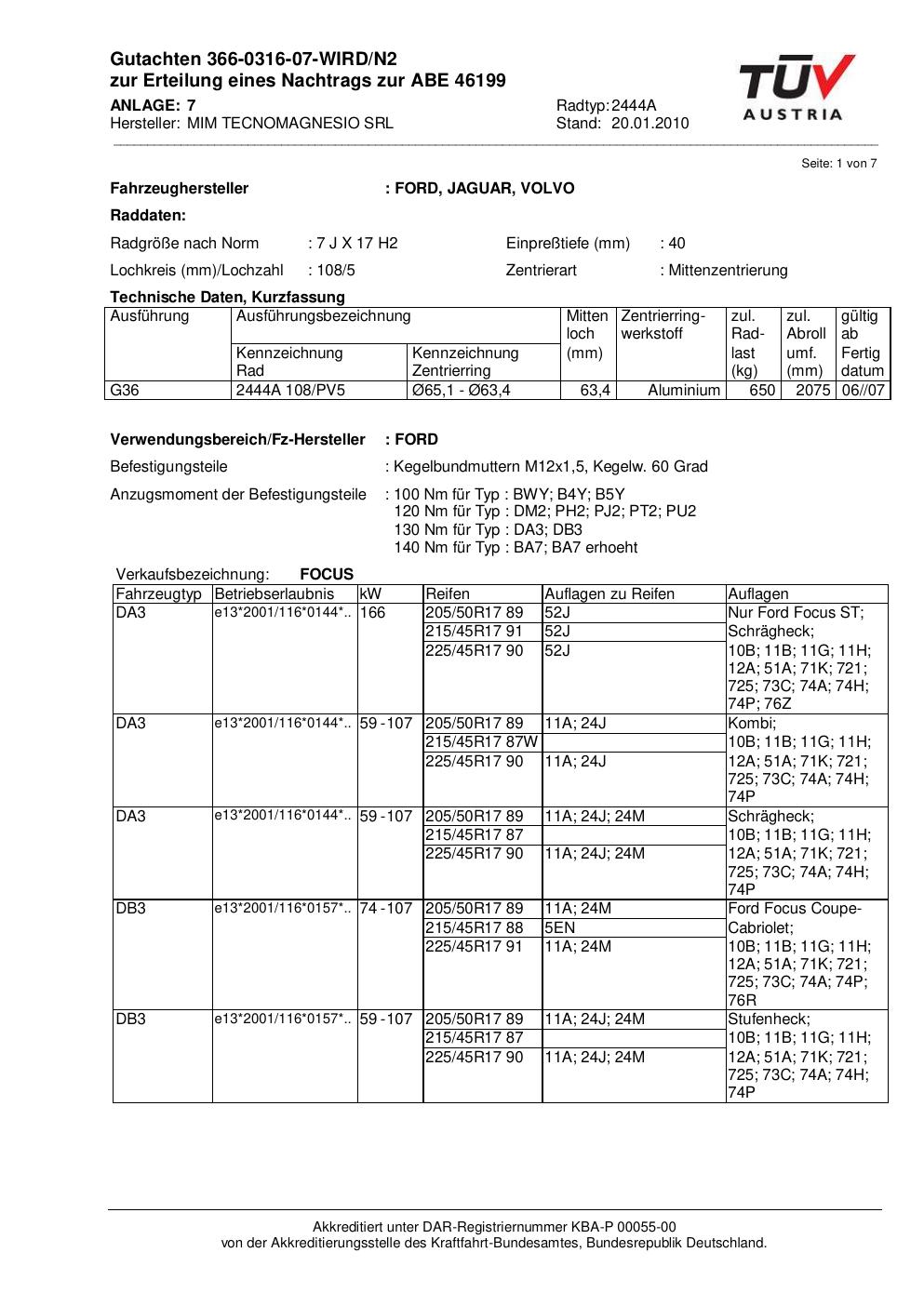 Dieses Gutachten (abe) bezieht sich auf die Alufelge MIM 2444A in der Ausführung ET 0, Mittenloch 0 mm (KBA 46199). Im PDF findest du typischerweise zulässige Reifengrößen, Auflagen/Anbauhinweise und – je nach Dokument – Hinweise zur Eintragung.