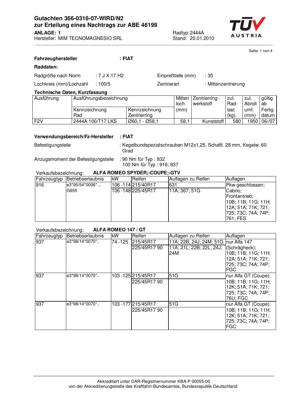 Dieses Gutachten (abe) bezieht sich auf die Alufelge MIM 2444A in der Ausführung ET 0, Mittenloch 0 mm (KBA 46199). Im PDF findest du typischerweise zulässige Reifengrößen, Auflagen/Anbauhinweise und – je nach Dokument – Hinweise zur Eintragung.