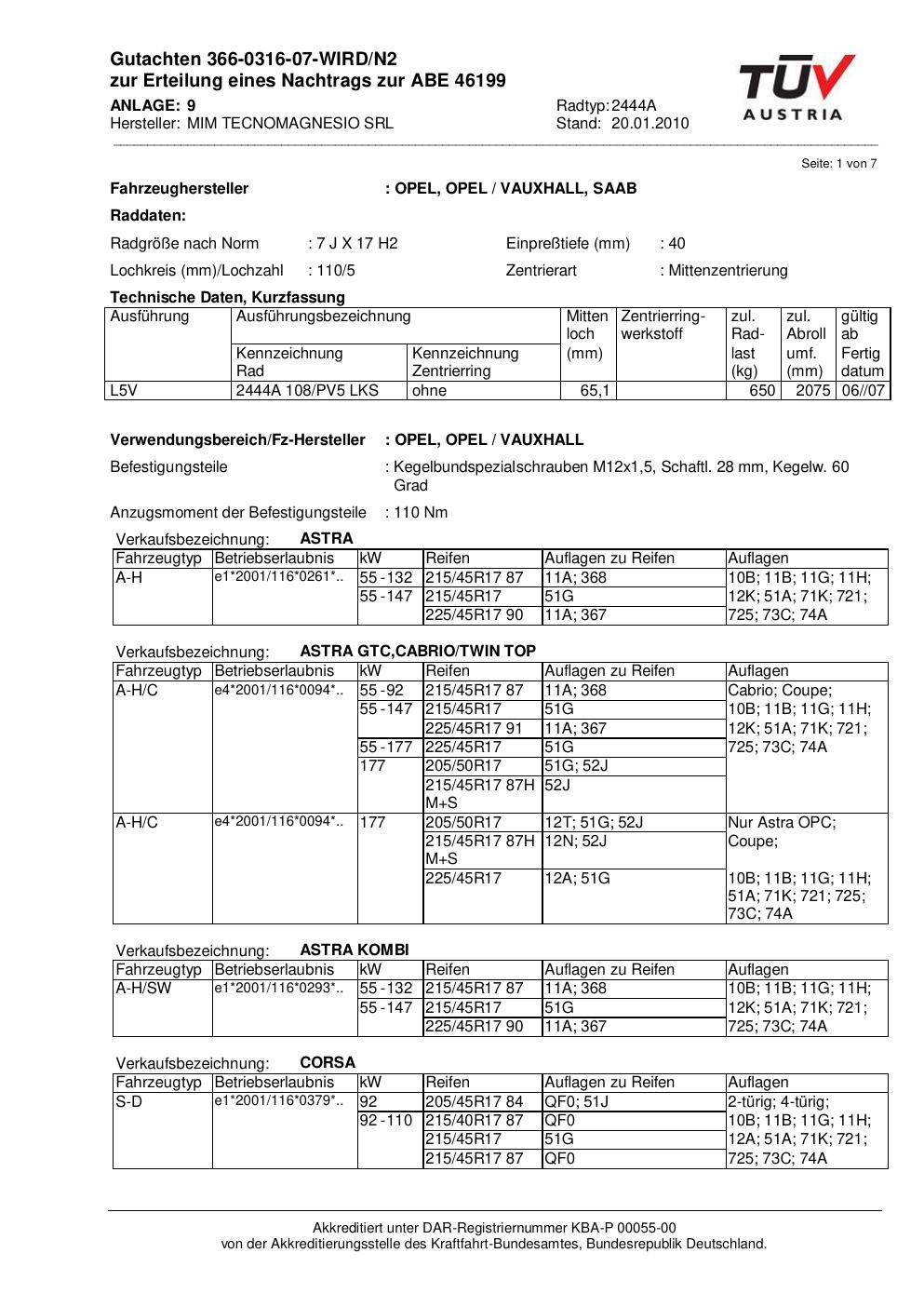 Dieses Gutachten (abe) bezieht sich auf die Alufelge MIM 2444A in der Ausführung ET 0, Mittenloch 0 mm (KBA 46199). Im PDF findest du typischerweise zulässige Reifengrößen, Auflagen/Anbauhinweise und – je nach Dokument – Hinweise zur Eintragung.