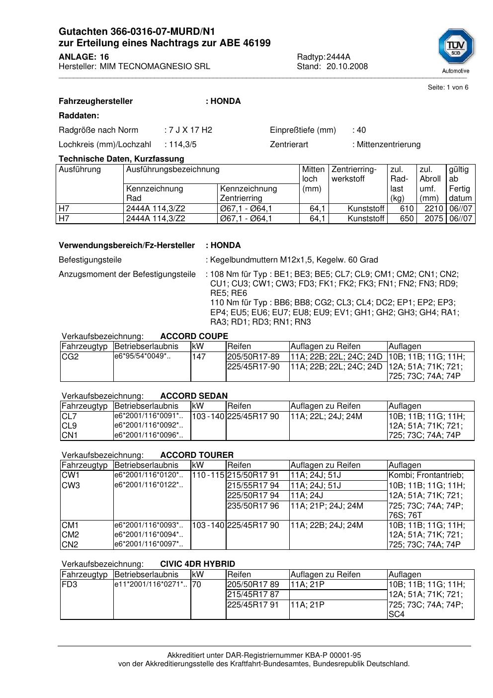 Felgengutachten / abe für Alufelgen MIM TECNOMAGNESIO SRL 2444A (ET 0, Mittenloch 0 mm) mit KBA 46199 (Zertifikatsnummer 46199). Hier kostenlos als PDF herunterladen. Der Download-Link ist 24 Stunden gültig und kann bis zu zwei Mal verwendet werden.