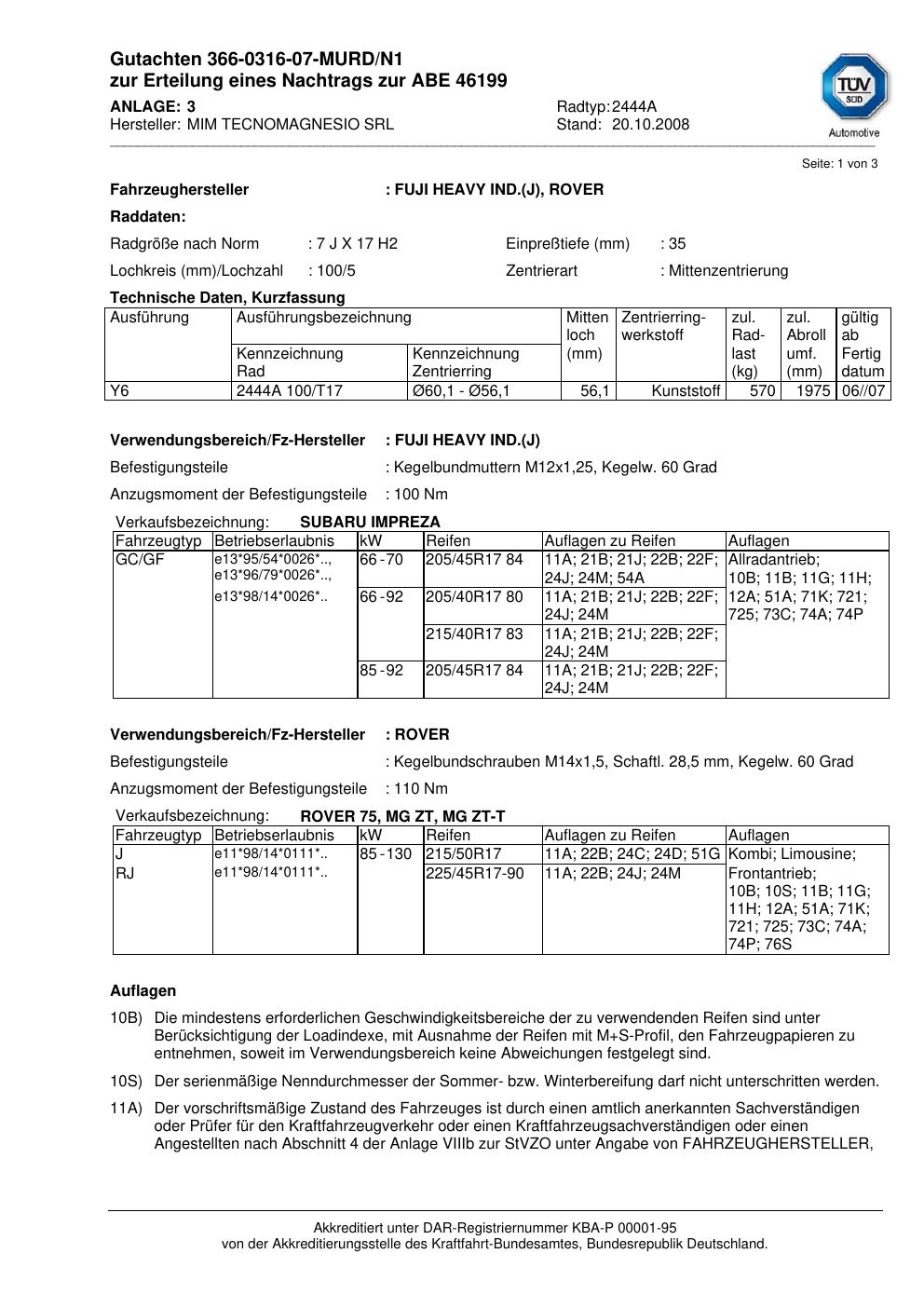 Dieses Gutachten (abe) bezieht sich auf die Alufelge MIM TECNOMAGNESIO SRL 2444A in der Ausführung ET 0, Mittenloch 0 mm (KBA 46199). Im PDF findest du typischerweise zulässige Reifengrößen, Auflagen/Anbauhinweise und – je nach Dokument – Hinweise zur Eintragung.