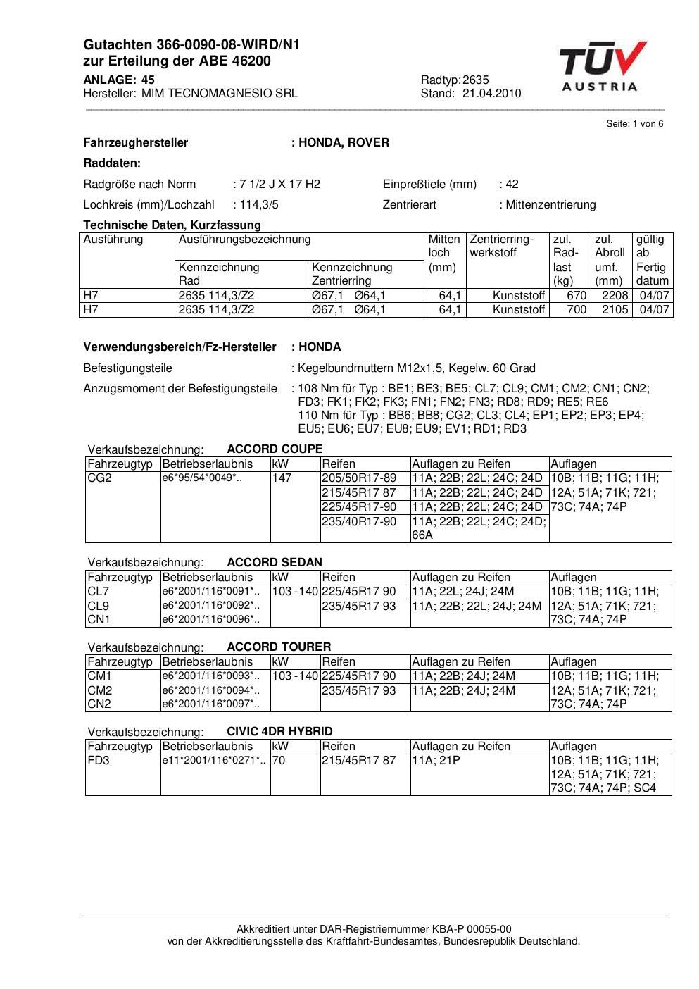 • Stimmt die KBA-Nummer auf der Felge mit diesem Dokument überein?