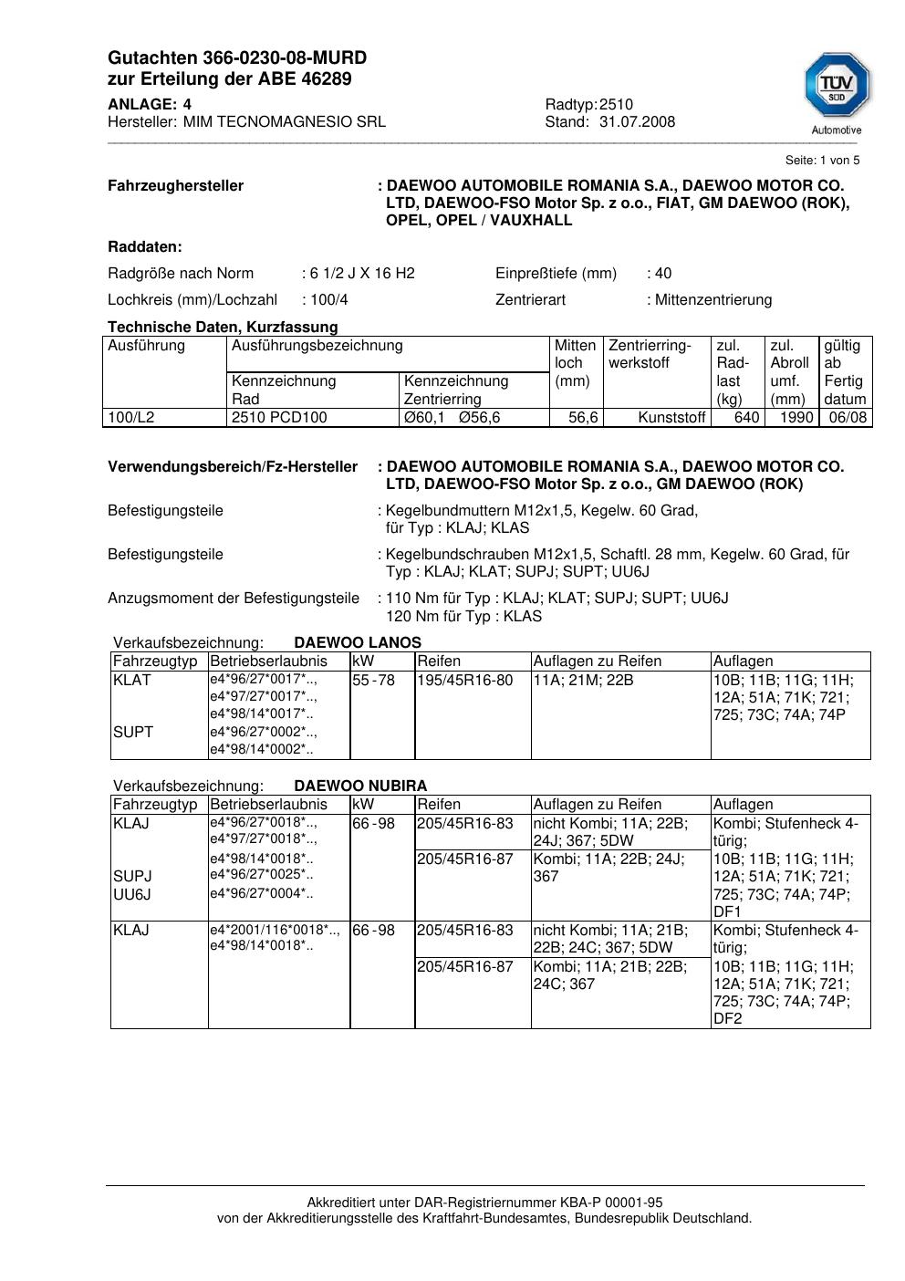 Dieses Gutachten (abe) bezieht sich auf die Alufelge MIM 2510 in der Ausführung ET 0, Mittenloch 0 mm (KBA 46289). Im PDF findest du typischerweise zulässige Reifengrößen, Auflagen/Anbauhinweise und – je nach Dokument – Hinweise zur Eintragung.