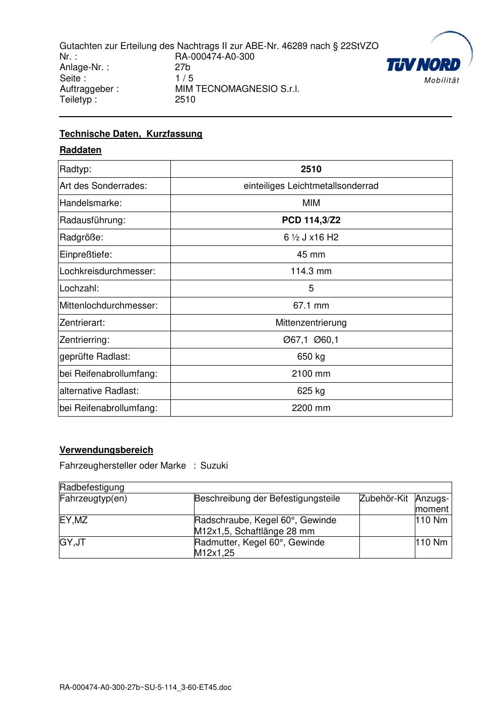 Dieses Gutachten (abe) bezieht sich auf die Alufelge MIM 2510 in der Ausführung ET 0, Mittenloch 0 mm (KBA 46289). Im PDF findest du typischerweise zulässige Reifengrößen, Auflagen/Anbauhinweise und – je nach Dokument – Hinweise zur Eintragung.