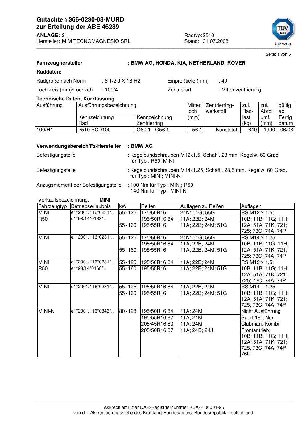 Dieses Gutachten (abe) bezieht sich auf die Alufelge MIM 2510 in der Ausführung ET 0, Mittenloch 0 mm (KBA 46289). Im PDF findest du typischerweise zulässige Reifengrößen, Auflagen/Anbauhinweise und – je nach Dokument – Hinweise zur Eintragung.